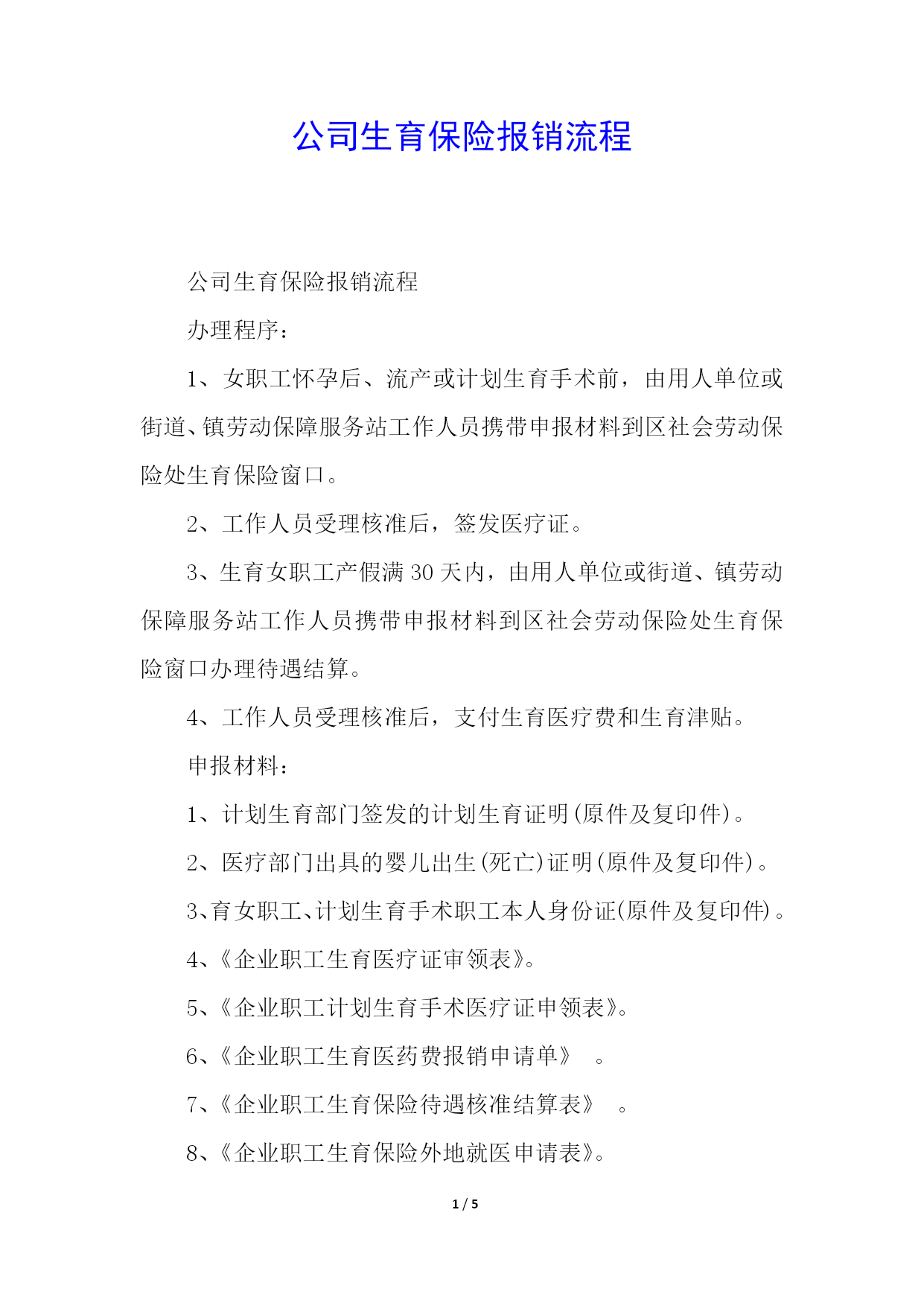 PAGE5/NUMPAGES5公司生育保险报销流程公司生育保险报销流程办理程序:1、女职工怀孕后、流产或计划生育手术前,由用人单位或街道、镇劳动保障服务站工作人员携带申报材料到区社会劳动保险处生育保险窗口。2、工作人员受理核准后,签发医疗证。3、生育女职工产假满30天内,由用人单位或街道、镇劳动保障服务站工作人员携带申报材料到区社会劳动保险处生育保险窗口办理待遇结算。4、工作人员受理核准后,支付生育医疗费和生育津贴。申报材料:1、计划生育部门签发的计划生育证明(原件及复印件)。2、医疗部门出具