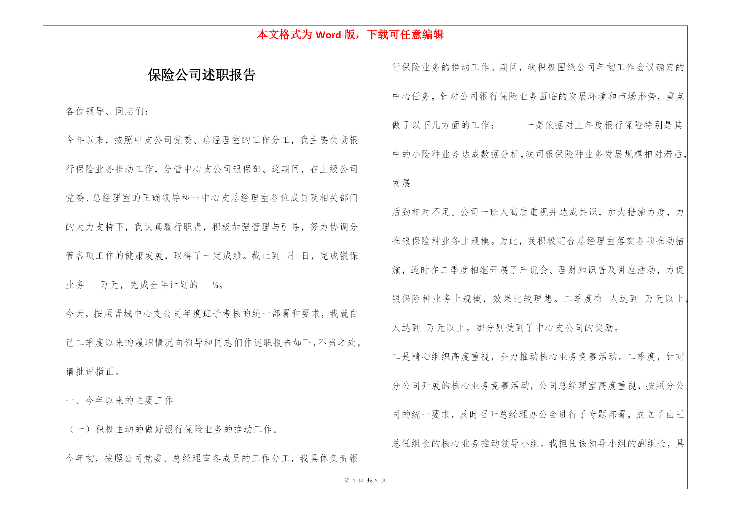 本文格式为Word版,下载可任意编辑第PAGE\*MERGEFORMAT5页共NUMPAGES\*MERGEFORMAT5页保险公司述职报告各位领导、同志们:今年以来,按照中支公司党委、总经理室的工作分工,我主要负责银行保险业务推动工作,分管中心支公司银保部。这期间,在上级公司党委、总经理室的正确领导和++中心支总经理室各位成员及相关部门的大力支持下,我认真履行职责,积极加强管理与引导,努力协调分管各项工作的健康发展,取得了一定成绩。截止到月日,完成银保业务万元,完成全年计划的%。今天,按照晋