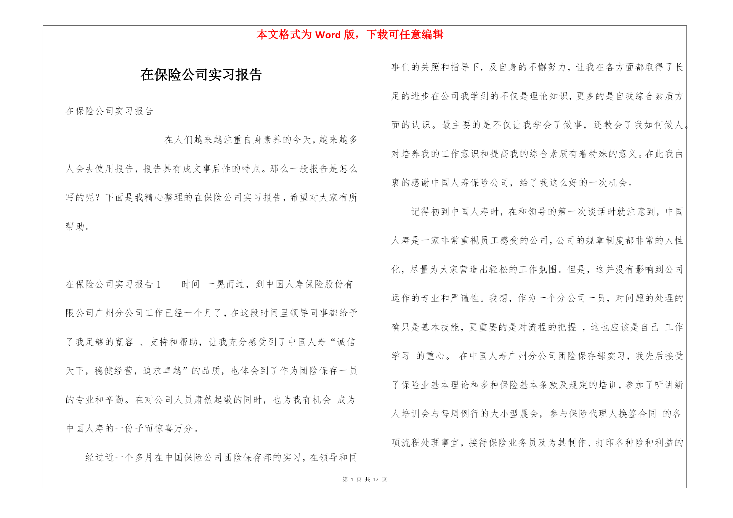 本文格式为Word版,下载可任意编辑第PAGE\*MERGEFORMAT12页共NUMPAGES\*MERGEFORMAT12页在保险公司实习报告在保险公司实习报告在人们越来越注重自身素养的今天,越来越多人会去使用报告,报告具有成文事后性的特点。那么一般报告是怎么写的呢?下面是我精心整理的在保险公司实习报告,希望对大家有所帮助。在保险公司实习报告1时间一晃而过,到中国人寿保险股份有限公司广州分公司工作已经一个月了,在这段时间里领导同事都给予了我足够的宽容、支持和帮助,让我充分感受到了中国人寿“