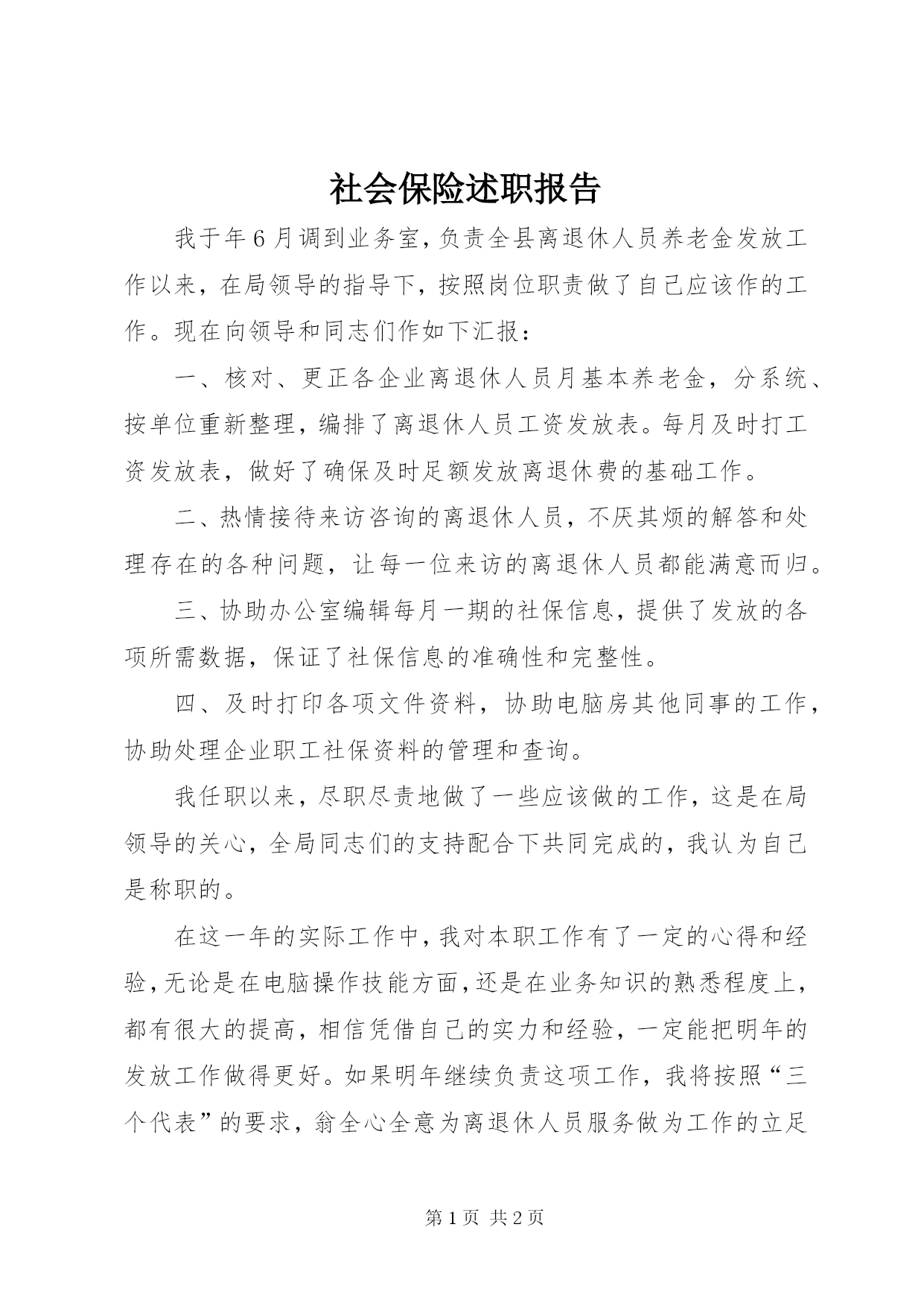 第PAGE\*Arabic\*MERGEFORMAT2页共NUMPAGES\*MERGEFORMAT2页社会保险述职报告我于年6月调到业务室,负责全县离退休人员养老金发放工作以来,在局领导的指导下,按照岗位职责做了自己应该作的工作。现在向领导和同志们作如下汇报:一、核对、更正各企业离退休人员月基本养老金,分系统、按单位重新整理,编排了离退休人员工资发放表。每月及时打工资发放表,做好了确保及时足额发放离退休费的基础工作。二、热情接待来访咨询的离退休人员,不厌其烦的解答和处理存在的各种问题,让每一