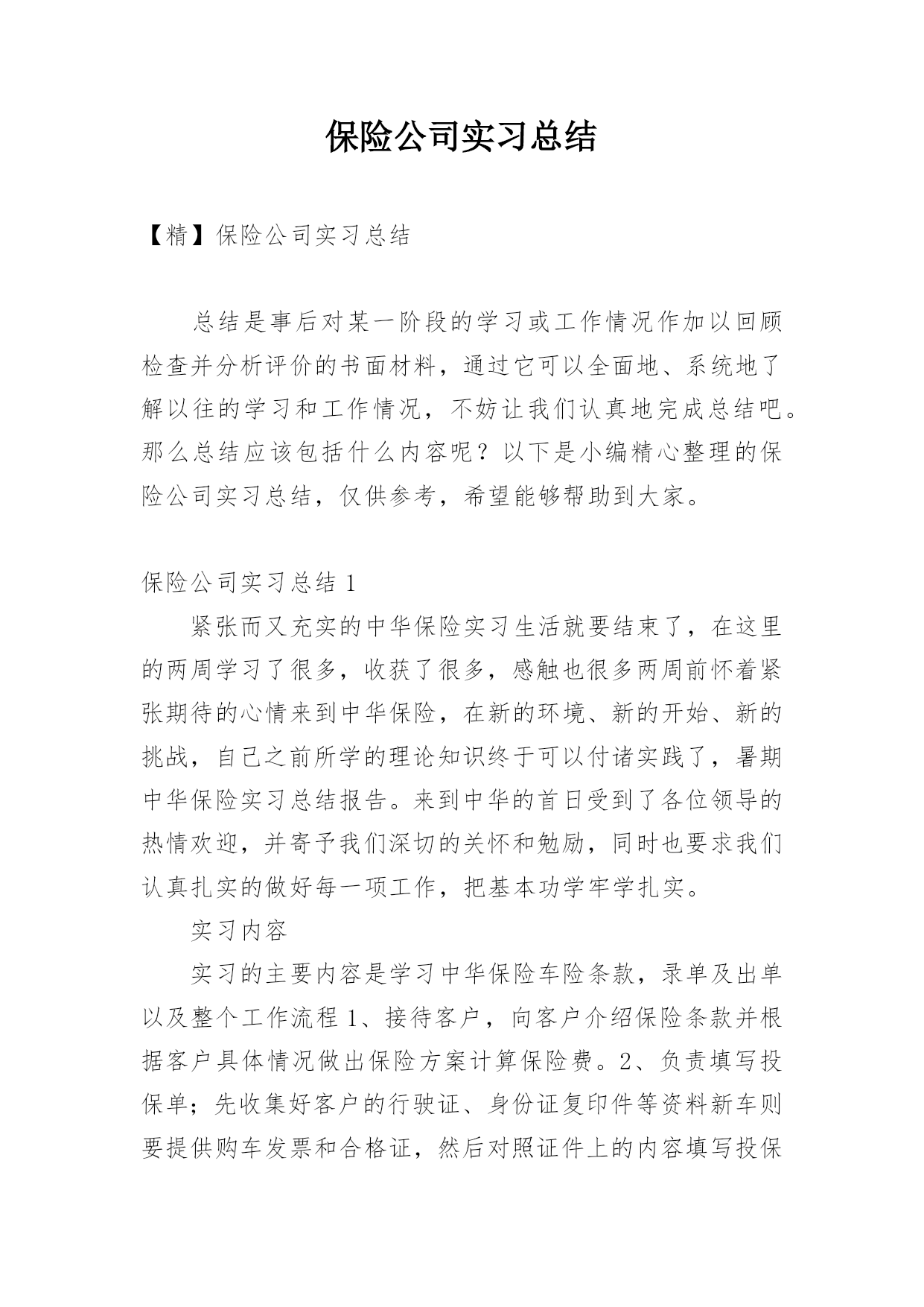 保险公司实习总结【精】保险公司实习总结总结是事后对某一阶段的学习或工作情况作加以回顾检查并分析评价的书面材料,通过它可以全面地、系统地了解以往的学习和工作情况,不妨让我们认真地完成总结吧。那么总结应该包括什么内容呢?以下是小编精心整理的保险公司实习总结,仅供参考,希望能够帮助到大家。保险公司实习总结1紧张而又充实的中华保险实习生活就要结束了,在这里的两周学习了很多,收获了很多,感触也很多两周前怀着紧张期待的心情来到中华保险,在新的环境、新的开始、新的挑战,自己之前所学的理论知识终于可以付诸实践了,暑期中华