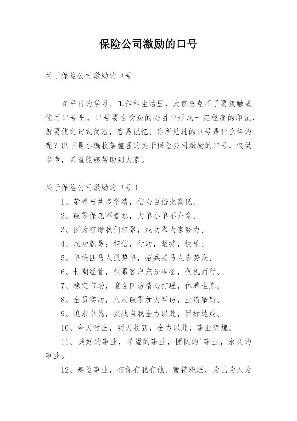 保险公司激励的口号关于保险公司激励的口号在平日的学习、工作和生活里,大家总免不了要接触或使用口号吧,口号要在受众的心目中形成一定程度的印记,就要使之句式简短,容易记忆。你所见过的口号是什么样的呢?以下是小编收集整理的关于保险公司激励的口号,仅供参考,希望能够帮助到大家。关于保险公司激励的口号11、荣辱与共多举绩,信心百倍比高低。2、破零保底不着急,大单小单不介意。3、因为有缘我们相聚,成功靠大家努力。4、成功就是:相信,行动,坚持,快乐。5、单枪匹马人孤势单,招兵买马人多势众。6、长期经营,积累客户充分准