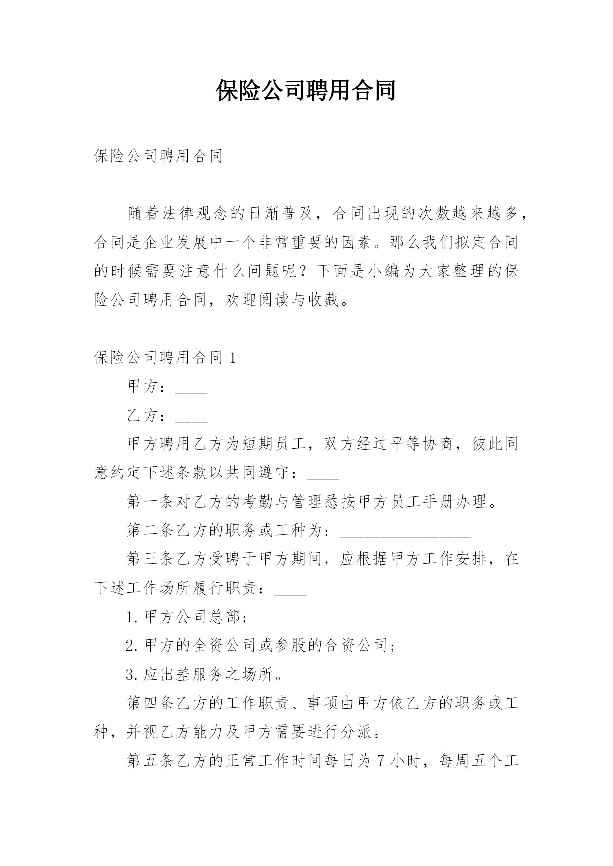保险公司聘用合同保险公司聘用合同随着法律观念的日渐普及,合同出现的次数越来越多,合同是企业发展中一个非常重要的因素。那么我们拟定合同的时候需要注意什么问题呢?下面是小编为大家整理的保险公司聘用合同,欢迎阅读与收藏。保险公司聘用合同1甲方:____乙方:____甲方聘用乙方为短期员工,双方经过平等协商,彼此同意约定下述条款以共同遵守:____第一条对乙方的考勤与管理悉按甲方员工手册办理。第二条乙方的职务或工种为:________________第三条乙方受聘于甲方期间,应根据甲方工作安排,在下述工作场所履行