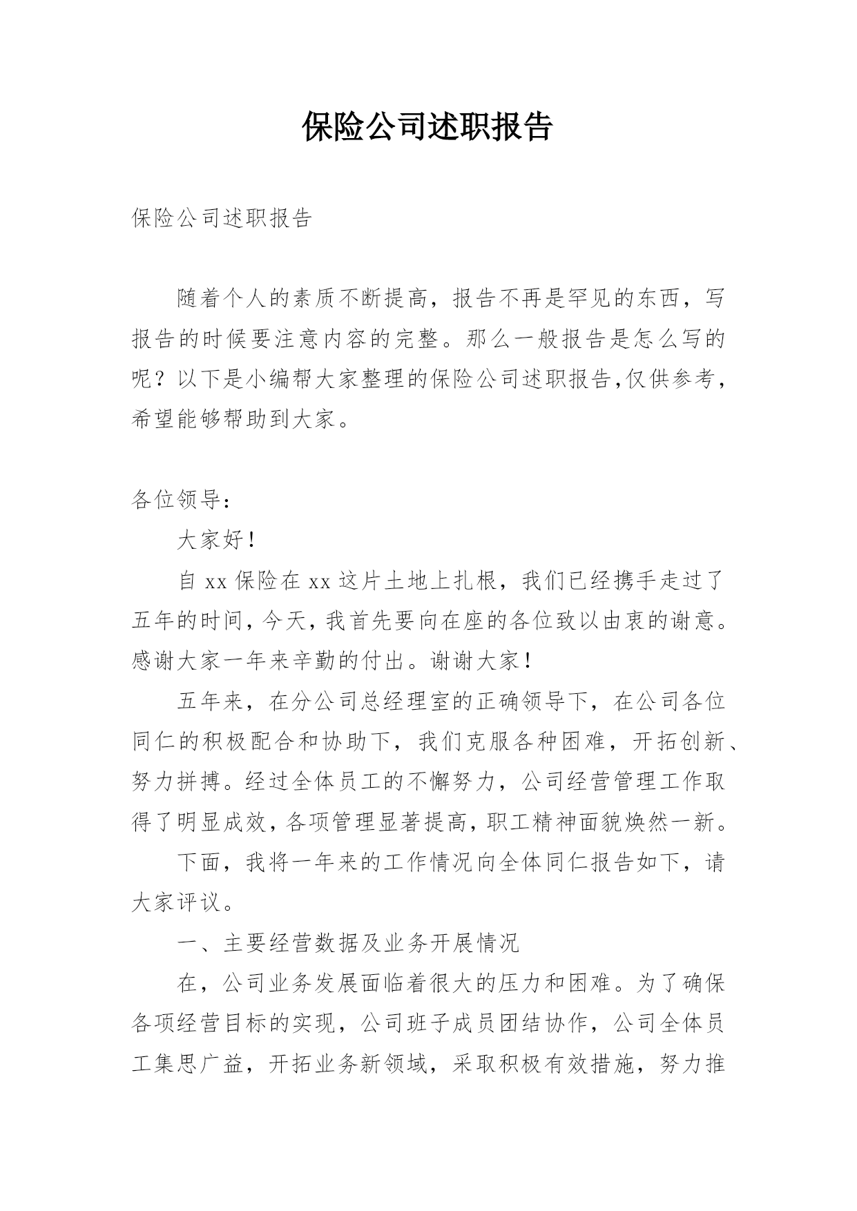 保险公司述职报告保险公司述职报告随着个人的素质不断提高,报告不再是罕见的东西,写报告的时候要注意内容的完整。那么一般报告是怎么写的呢?以下是小编帮大家整理的保险公司述职报告,仅供参考,希望能够帮助到大家。各位领导:大家好!自xx保险在xx这片土地上扎根,我们已经携手走过了五年的时间,今天,我首先要向在座的各位致以由衷的谢意。感谢大家一年来辛勤的付出。谢谢大家!五年来,在分公司总经理室的正确领导下,在公司各位同仁的积极配合和协助下,我们克服各种困难,开拓创新、努力拼搏。经过全体员工的不懈努力,公司经营管理工