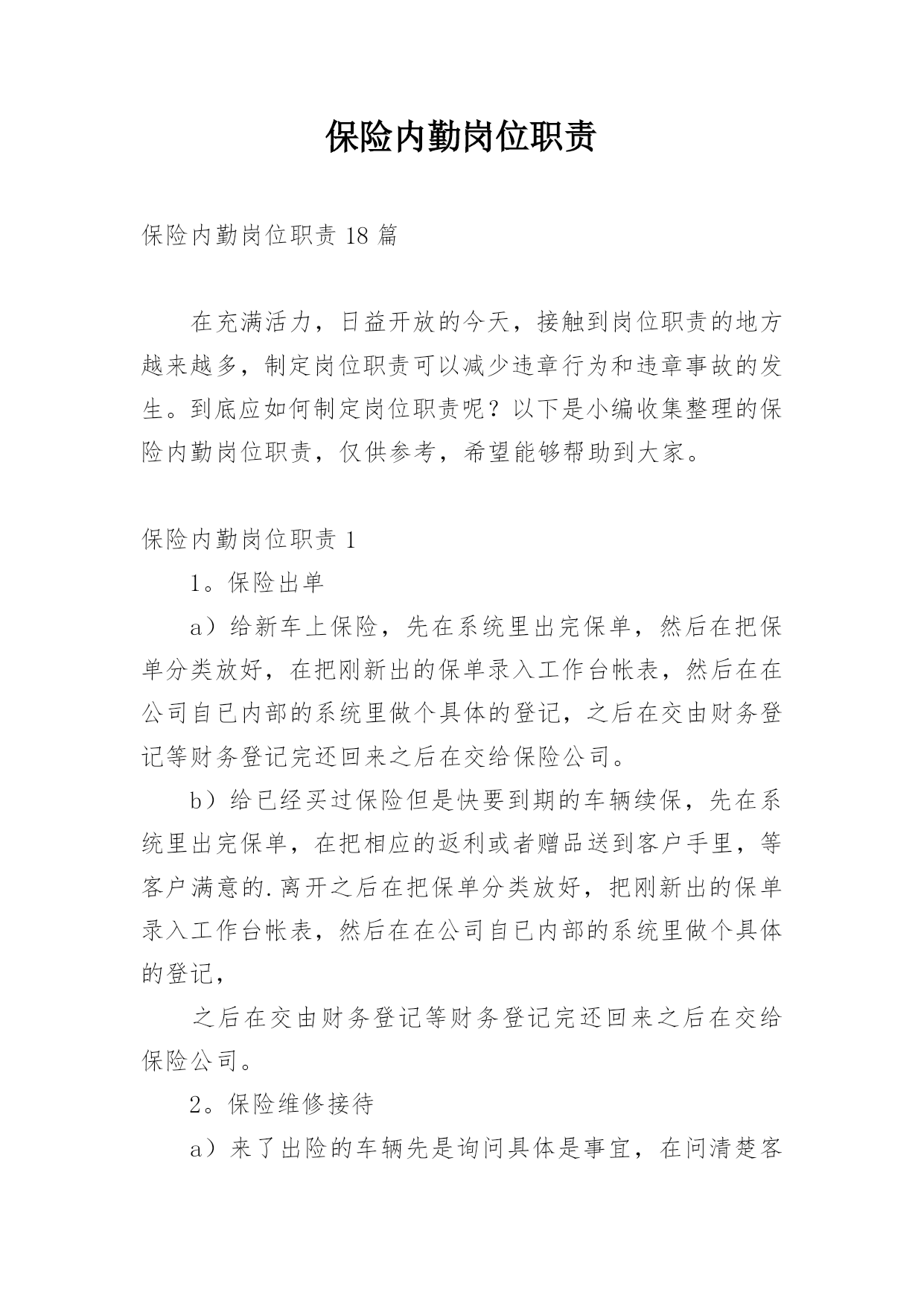 保险内勤岗位职责保险内勤岗位职责18篇在充满活力,日益开放的今天,接触到岗位职责的地方越来越多,制定岗位职责可以减少违章行为和违章事故的发生。到底应如何制定岗位职责呢?以下是小编收集整理的保险内勤岗位职责,仅供参考,希望能够帮助到大家。保险内勤岗位职责11。保险出单a)给新车上保险,先在系统里出完保单,然后在把保单分类放好,在把刚新出的保单录入工作台帐表,然后在在公司自已内部的系统里做个具体的登记,之后在交由财务登记等财务登记完还回来之后在交给保险公司。b)给已经买过保险但是快要到期的车辆续保,先在系统里