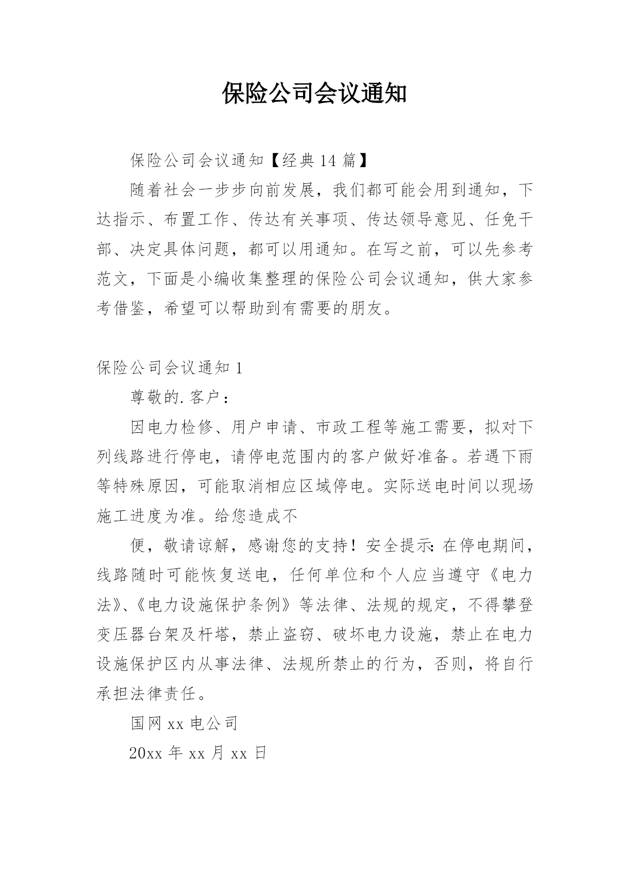 保险公司会议通知保险公司会议通知【经典14篇】随着社会一步步向前发展,我们都可能会用到通知,下达指示、布置工作、传达有关事项、传达领导意见、任免干部、决定具体问题,都可以用通知。在写之前,可以先参考范文,下面是小编收集整理的保险公司会议通知,供大家参考借鉴,希望可以帮助到有需要的朋友。保险公司会议通知1尊敬的.客户:因电力检修、用户申请、市政工程等施工需要,拟对下列线路进行停电,请停电范围内的客户做好准备。若遇下雨等特殊原因,可能取消相应区域停电。实际送电时间以现场施工进度为准。给您造成不便,敬请谅解,感