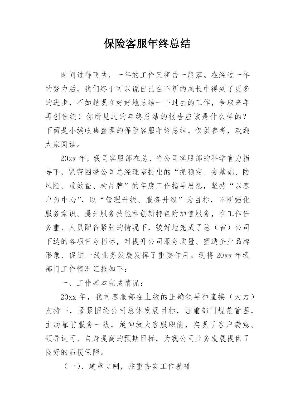 保险客服年终总结时间过得飞快,一年的工作又将告一段落。在经过一年的努力后,我们终于可以说自己在不断的成长中得到了更多的进步,不如趁现在好好地总结一下过去的工作,争取来年再创佳绩!你所见过的年终总结的报告应该是什么样的?下面是小编收集整理的保险客服年终总结,仅供参考,欢迎大家阅读。20xx年,我司客服部在总、省公司客服部的科学有力指导下,紧密围绕公司总经理室提出的“抓稳定、夯基础、防风险、重效益、树品牌”的年度工作指导思想,坚持“以客户为中心”,以“管理升级、服务升级”为目标,不断强化服务意识、提升服务技能
