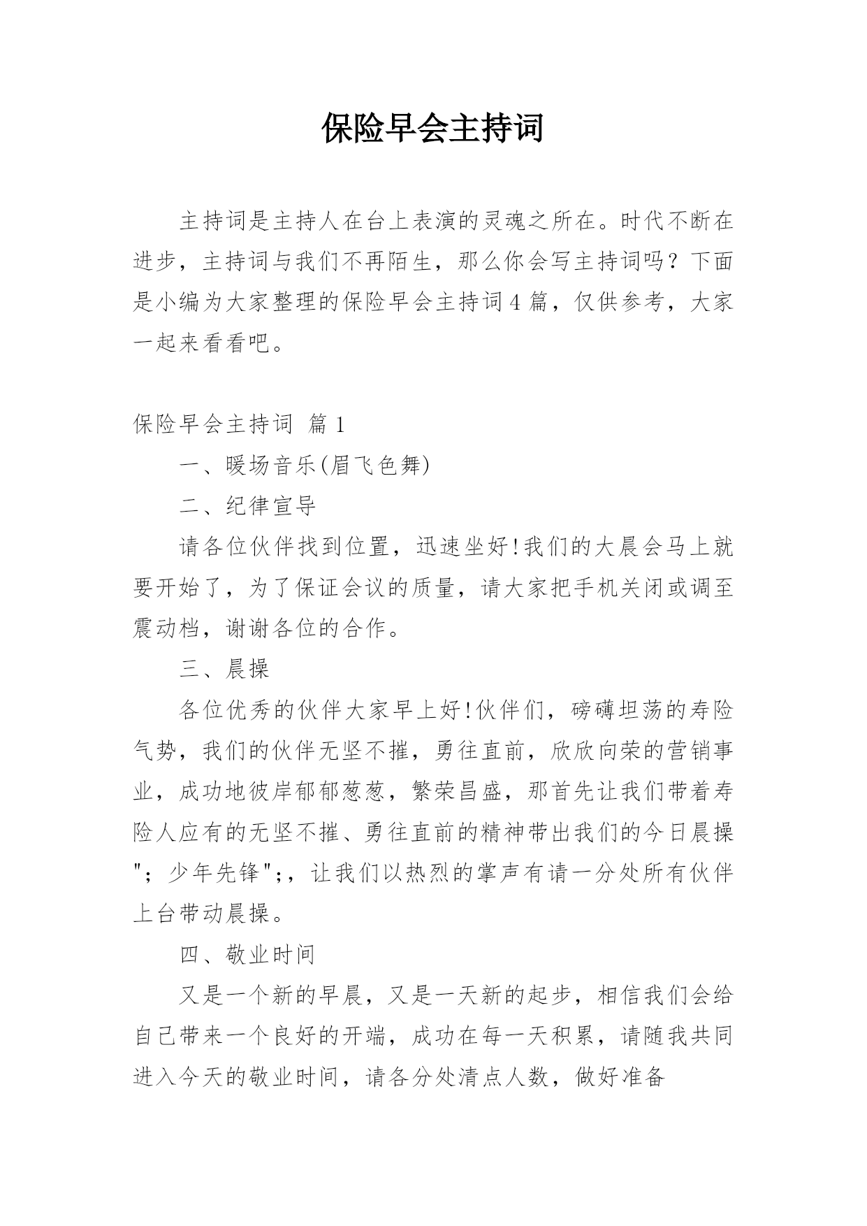 保险早会主持词主持词是主持人在台上表演的灵魂之所在。时代不断在进步,主持词与我们不再陌生,那么你会写主持词吗?下面是小编为大家整理的保险早会主持词4篇,仅供参考,大家一起来看看吧。保险早会主持词篇1一、暖场音乐(眉飞色舞)二、纪律宣导请各位伙伴找到位置,迅速坐好!我们的大晨会马上就要开始了,为了保证会议的质量,请大家把手机关闭或调至震动档,谢谢各位的合作。三、晨操各位优秀的伙伴大家早上好!伙伴们,磅礴坦荡的寿险气势,我们的伙伴无坚不摧,勇往直前,欣欣向荣的营销事业,成功地彼岸郁郁葱葱,繁荣昌盛,那首先让我