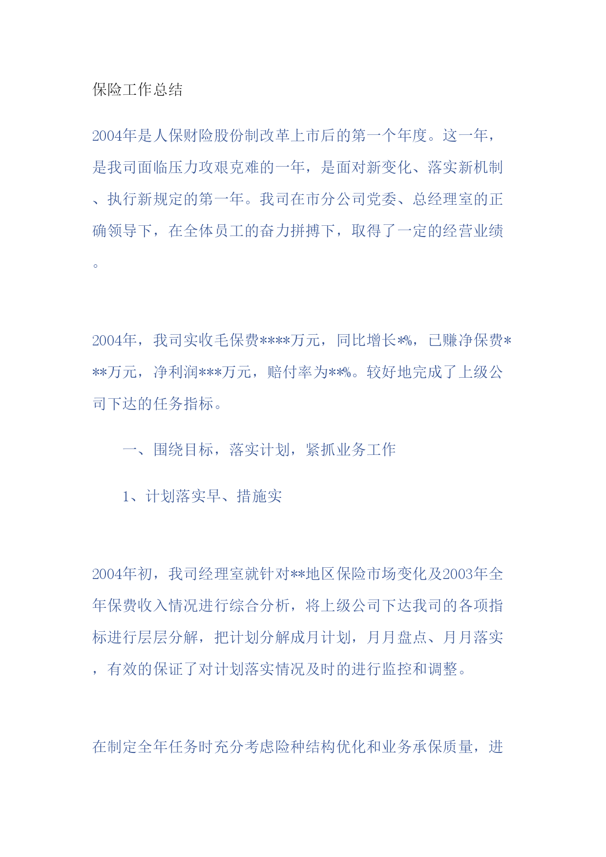 保险工作总结2004年是人保财险股份制改革上市后的第一个年度。这一年,是我司面临压力攻艰克难的一年,是面对新变化、落实新机制、执行新规定的第一年。我司在市分公司党委、总经理室的正确领导下,在全体员工的奋力拼搏下,取得了一定的经营业绩。2004年,我司实收毛保费****万元,同比增长*%,已赚净保费***万元,净利润***万元,赔付率为**%。较好地完成了上级公司下达的任务指标。一、围绕目标,落实计划,紧抓业务工作1、计划落实早、措施实2004年初,我司经理室就针对**地区保险市场变化及2003年全年保费收