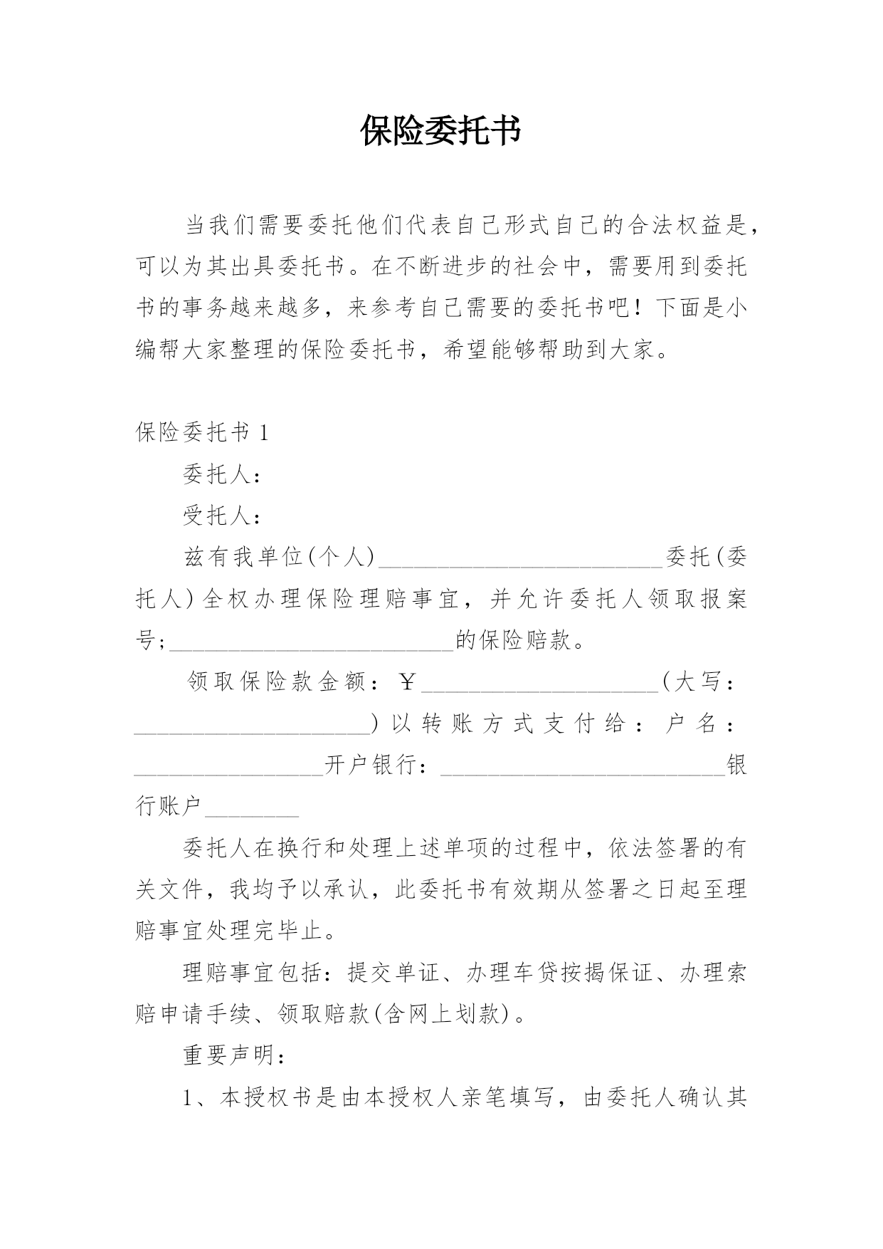 保险委托书当我们需要委托他们代表自己形式自己的合法权益是,可以为其出具委托书。在不断进步的社会中,需要用到委托书的事务越来越多,来参考自己需要的委托书吧!下面是小编帮大家整理的保险委托书,希望能够帮助到大家。保险委托书1委托人:受托人:兹有我单位(个人)________________________委托(委托人)全权办理保险理赔事宜,并允许委托人领取报案号;________________________的保险赔款。领取保险款金额:¥____________________(大写:___________