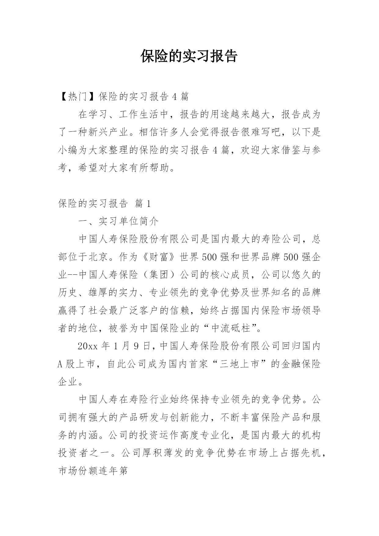 保险的实习报告【热门】保险的实习报告4篇在学习、工作生活中,报告的用途越来越大,报告成为了一种新兴产业。相信许多人会觉得报告很难写吧,以下是小编为大家整理的保险的实习报告4篇,欢迎大家借鉴与参考,希望对大家有所帮助。保险的实习报告篇1一、实习单位简介中国人寿保险股份有限公司是国内最大的寿险公司,总部位于北京。作为《财富》世界500强和世界品牌500强企业--中国人寿保险(集团)公司的核心成员,公司以悠久的历史、雄厚的实力、专业领先的竞争优势及世界知名的品牌赢得了社会最广泛客户的信赖,始终占据国内保险市场领
