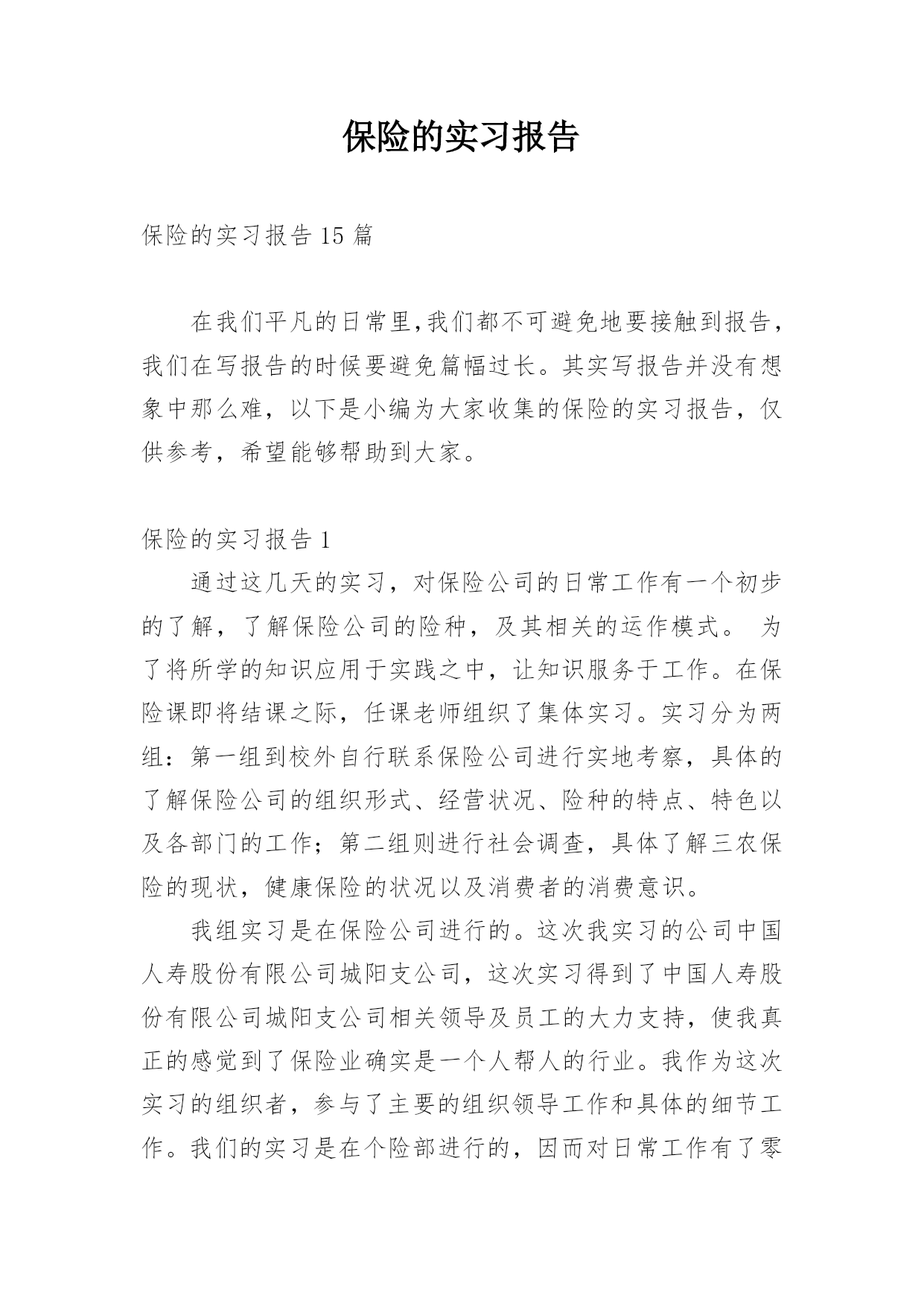保险的实习报告保险的实习报告15篇在我们平凡的日常里,我们都不可避免地要接触到报告,我们在写报告的时候要避免篇幅过长。其实写报告并没有想象中那么难,以下是小编为大家收集的保险的实习报告,仅供参考,希望能够帮助到大家。保险的实习报告1通过这几天的实习,对保险公司的日常工作有一个初步的了解,了解保险公司的险种,及其相关的运作模式。为了将所学的知识应用于实践之中,让知识服务于工作。在保险课即将结课之际,任课老师组织了集体实习。实习分为两组:第一组到校外自行联系保险公司进行实地考察,具体的了解保险公司的组织形式、