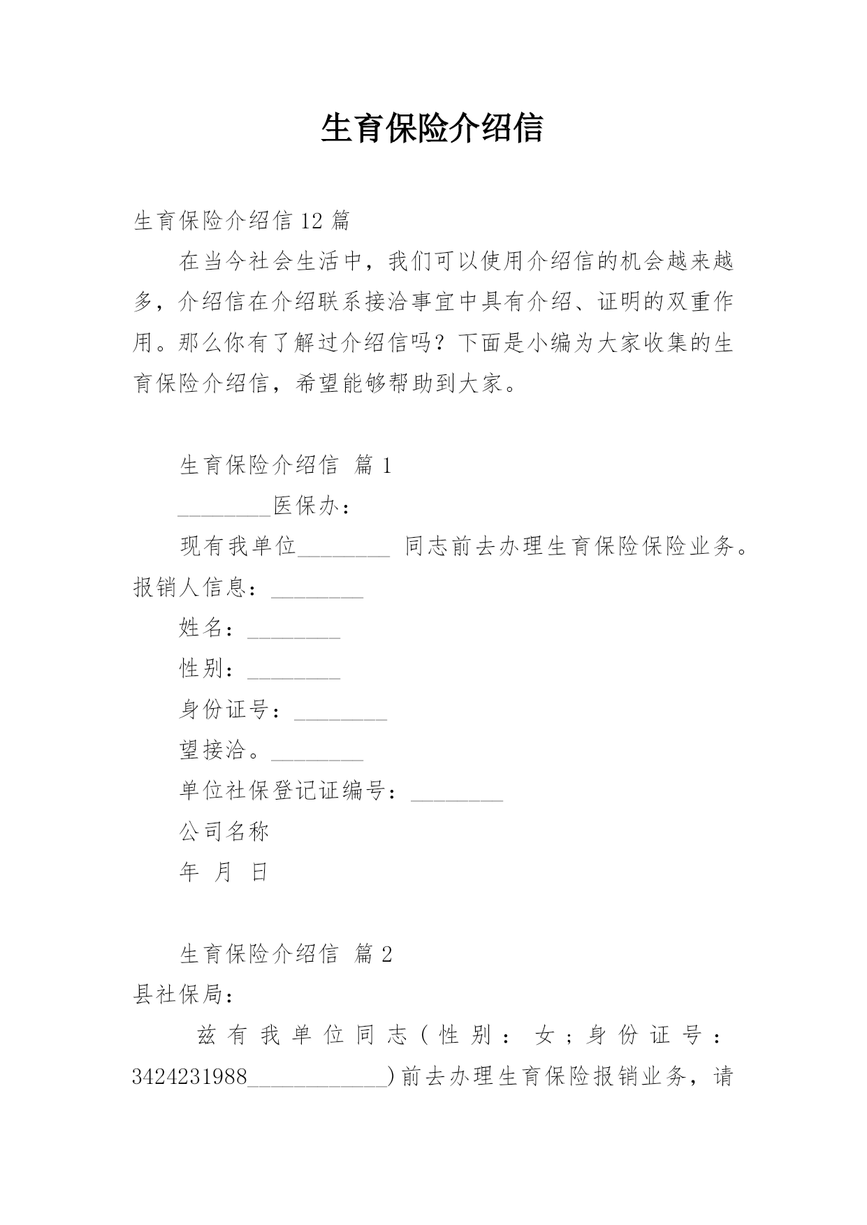 生育保险介绍信生育保险介绍信12篇在当今社会生活中,我们可以使用介绍信的机会越来越多,介绍信在介绍联系接洽事宜中具有介绍、证明的双重作用。那么你有了解过介绍信吗?下面是小编为大家收集的生育保险介绍信,希望能够帮助到大家。生育保险介绍信篇1________医保办:现有我单位________同志前去办理生育保险保险业务。报销人信息:________姓名:________性别:________身份证号:________望接洽。________单位社保登记证编号:________公司名称年月日生育保险介绍信篇2县