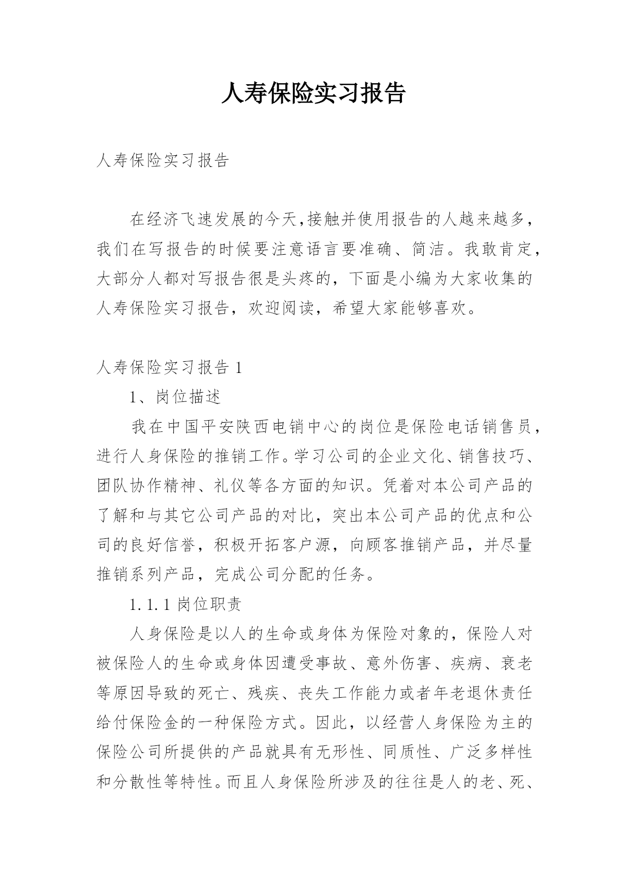 人寿保险实习报告人寿保险实习报告在经济飞速发展的今天,接触并使用报告的人越来越多,我们在写报告的时候要注意语言要准确、简洁。我敢肯定,大部分人都对写报告很是头疼的,下面是小编为大家收集的人寿保险实习报告,欢迎阅读,希望大家能够喜欢。人寿保险实习报告11、岗位描述我在中国平安陕西电销中心的岗位是保险电话销售员,进行人身保险的推销工作。学习公司的企业文化、销售技巧、团队协作精神、礼仪等各方面的知识。凭着对本公司产品的了解和与其它公司产品的对比,突出本公司产品的优点和公司的良好信誉,积极开拓客户源,向顾客推销产