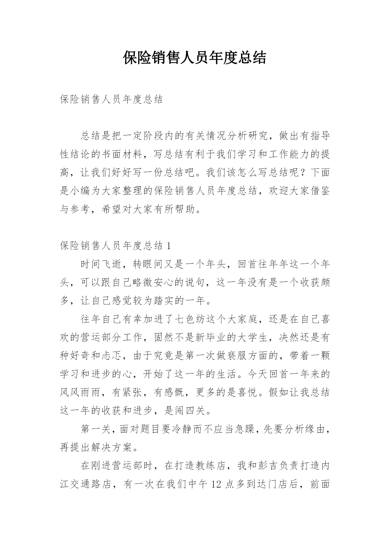 保险销售人员年度总结保险销售人员年度总结总结是把一定阶段内的有关情况分析研究,做出有指导性结论的书面材料,写总结有利于我们学习和工作能力的提高,让我们好好写一份总结吧。我们该怎么写总结呢?下面是小编为大家整理的保险销售人员年度总结,欢迎大家借鉴与参考,希望对大家有所帮助。保险销售人员年度总结1时间飞逝,转眼间又是一个年头,回首往年年这一个年头,可以跟自己略微安心的说句,这一年没有是一个收获颇多,让自己感觉较为踏实的一年。往年自己有幸加进了七色纺这个大家庭,还是在自己喜欢的营运部分工作,固然不是新毕业的大学
