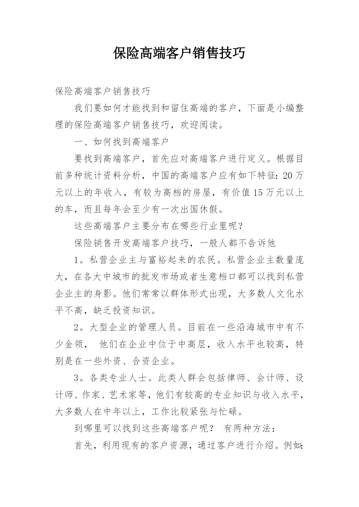 保险高端客户销售技巧保险高端客户销售技巧我们要如何才能找到和留住高端的客户,下面是小编整理的保险高端客户销售技巧,欢迎阅读。一、如何找到高端客户要找到高端客户,首先应对高端客户进行定义。根据目前多种统计资料分析,中国的高端客户应有如下特征:20万元以上的年收入,有较为高档的房屋,有价值15万元以上的车,而且每年会至少有一次出国休假。这些高端客户主要分布在哪些行业里呢?保险销售开发高端客户技巧,一般人都不告诉他1。私营企业主与富裕起来的农民。私营企业主数量庞大,在各大中城市的批发市场或者生意档口都可以找到私