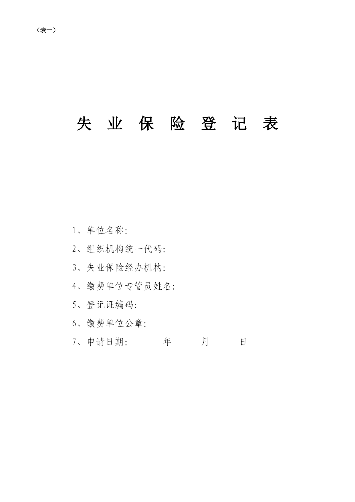(表一)失业保险登记表1、单位名称:2、组织机构统一代码:3、失业保险经办机构:4、缴费单位专管员姓名:5、登记证编码:6、缴费单位公章:7、申请日期:年月日《失业保险登记表》填写说明1、本表由用人单位申请办理失业保险登记时填写。2、参保单位名称(章):与工商登记、有关单位批准成立证件或其他核准执业证件中单位名称一致。3、登记类型、单位类型、经济类型、事业单位经费来源、隶属关系、参保险种等参保单位根据实情况在所选择项的方框内用“√”表示。参保单位是事业单位类型的,还需在“是否是企业化管理”项内相应选择“是