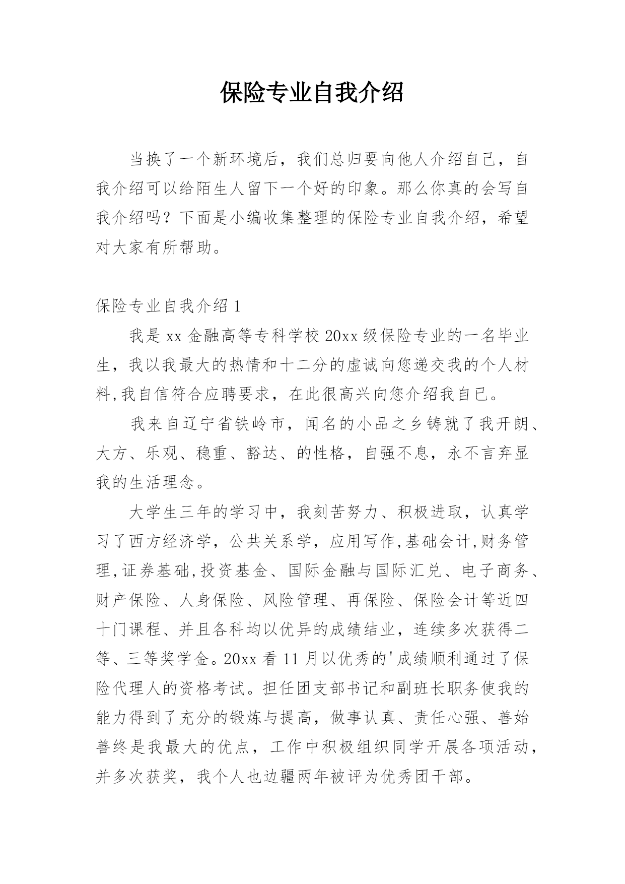 保险专业自我介绍当换了一个新环境后,我们总归要向他人介绍自己,自我介绍可以给陌生人留下一个好的印象。那么你真的会写自我介绍吗?下面是小编收集整理的保险专业自我介绍,希望对大家有所帮助。保险专业自我介绍1我是xx金融高等专科学校20xx级保险专业的一名毕业生,我以我最大的热情和十二分的虚诚向您递交我的个人材料,我自信符合应聘要求,在此很高兴向您介绍我自已。我来自辽宁省铁岭市,闻名的小品之乡铸就了我开朗、大方、乐观、稳重、豁达、的性格,自强不息,永不言弃显我的生活理念。大学生三年的学习中,我刻苦努力、积极进取
