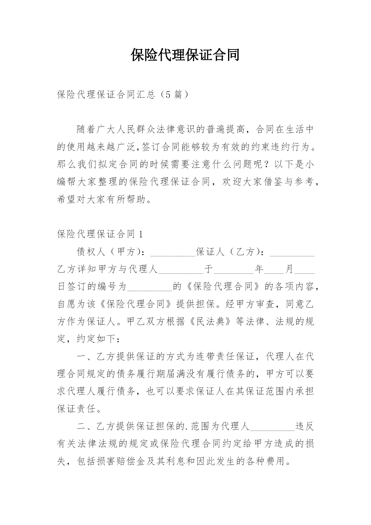 保险代理保证合同保险代理保证合同汇总(5篇)随着广大人民群众法律意识的普遍提高,合同在生活中的使用越来越广泛,签订合同能够较为有效的约束违约行为。那么我们拟定合同的时候需要注意什么问题呢?以下是小编帮大家整理的保险代理保证合同,欢迎大家借鉴与参考,希望对大家有所帮助。保险代理保证合同1债权人(甲方):_________保证人(乙方):_________乙方详知甲方与代理人_________于________年____月____日签订的编号为_________的《保险代理合同》的各项内容,自愿为该《保险代理