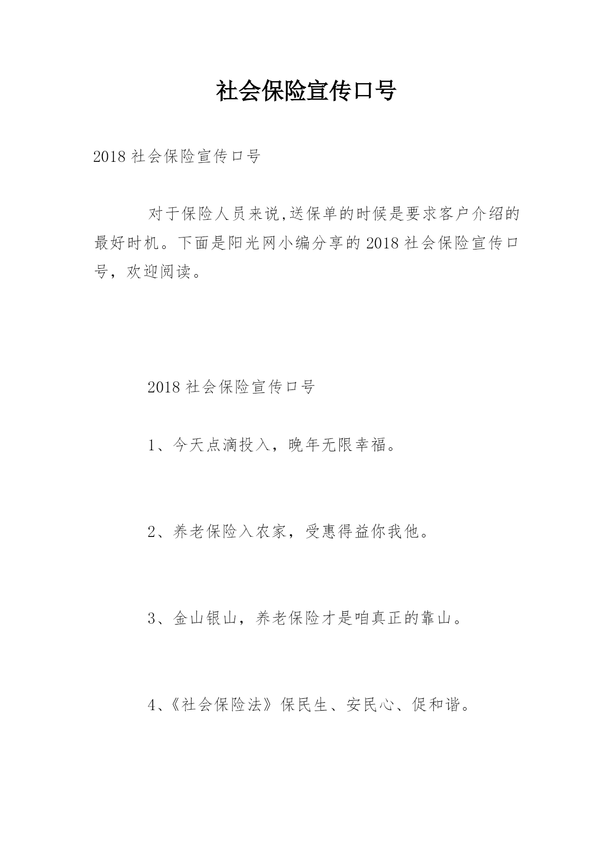 社会保险宣传口号2018社会保险宣传口号对于保险人员来说,送保单的时候是要求客户介绍的最好时机。下面是阳光网小编分享的2018社会保险宣传口号,欢迎阅读。2018社会保险宣传口号1、今天点滴投入,晚年无限幸福。2、养老保险入农家,受惠得益你我他。3、金山银山,养老保险才是咱真正的靠山。4、《社会保险法》保民生、安民心、促和谐。5、年轻入农保,夕阳无限好。6、缴费年限长、缴费缴的多,养老金水平高。7、社会保险,政府主导,互助共济,百姓受益。8、你参保,我参保,他参保,保增长,保民生,保稳定。9、新型农保解民