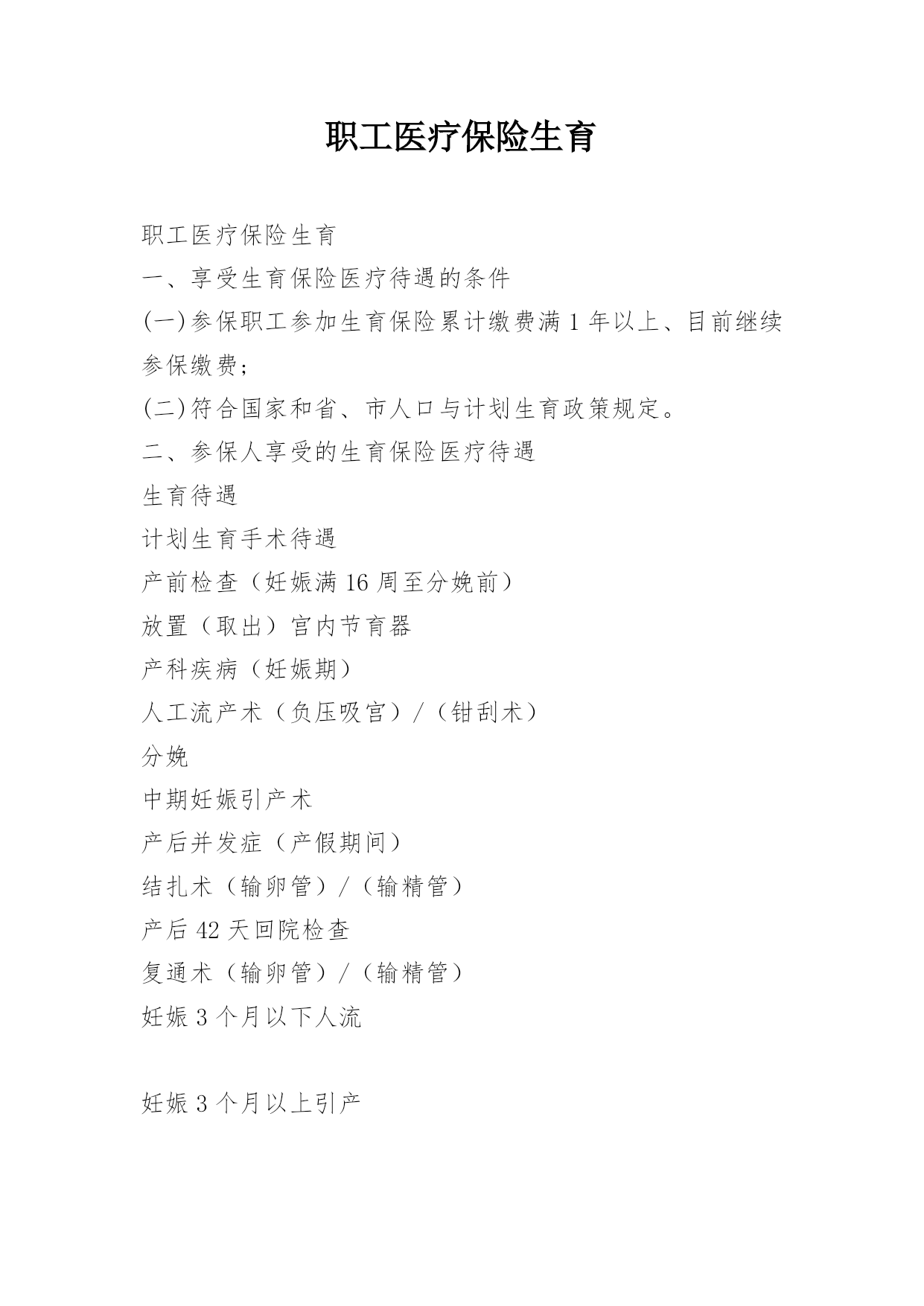 职工医疗保险生育职工医疗保险生育一、享受生育保险医疗待遇的条件(一)参保职工参加生育保险累计缴费满1年以上、目前继续参保缴费;(二)符合国家和省、市人口与计划生育政策规定。二、参保人享受的生育保险医疗待遇生育待遇计划生育手术待遇产前检查(妊娠满16周至分娩前)放置(取出)宫内节育器产科疾病(妊娠期)人工流产术(负压吸宫)/(钳刮术)分娩中期妊娠引产术产后并发症(产假期间)结扎术(输卵管)/(输精管)产后42天回院检查复通术(输卵管)/(输精管)妊娠3个月以下人流妊娠3个月以上引产三、生育的就医确认及申报生