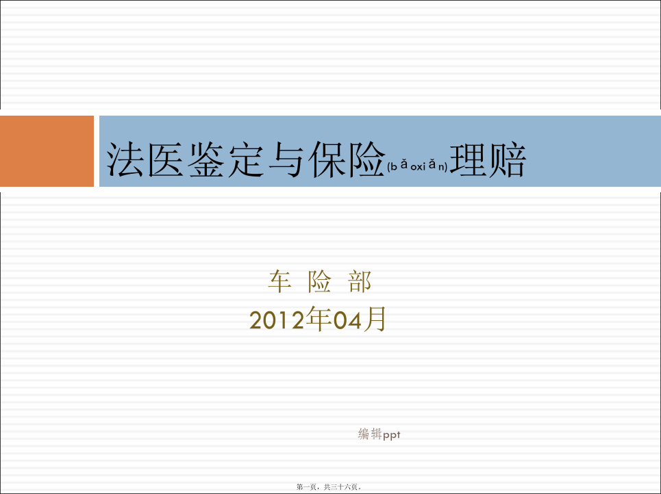 车险部2012年04月我国法医的基本(jīběn)框架我国法医(fǎyī)的基本框架各系统(xìtǒng)法医的业务范围法医学鉴定(jiàndìng)的分类法医物证学鉴定:个体识别、亲子鉴定、性别鉴定、种族和种属认定等(DNA鉴定)。司法精神病鉴定:判定行为人有无刑事责任能力、民事行为能力、监护能力、自我防卫能力、作证能力等;对精神损伤程度、智能障碍等进行鉴定。毒物学检验:毒品检验、毒物检验、中毒检验、酒精含量测定等;文证鉴定:笔记鉴定、书写(shūxiě)时间鉴定、印章鉴定等;7微量物证的鉴定:对物质中