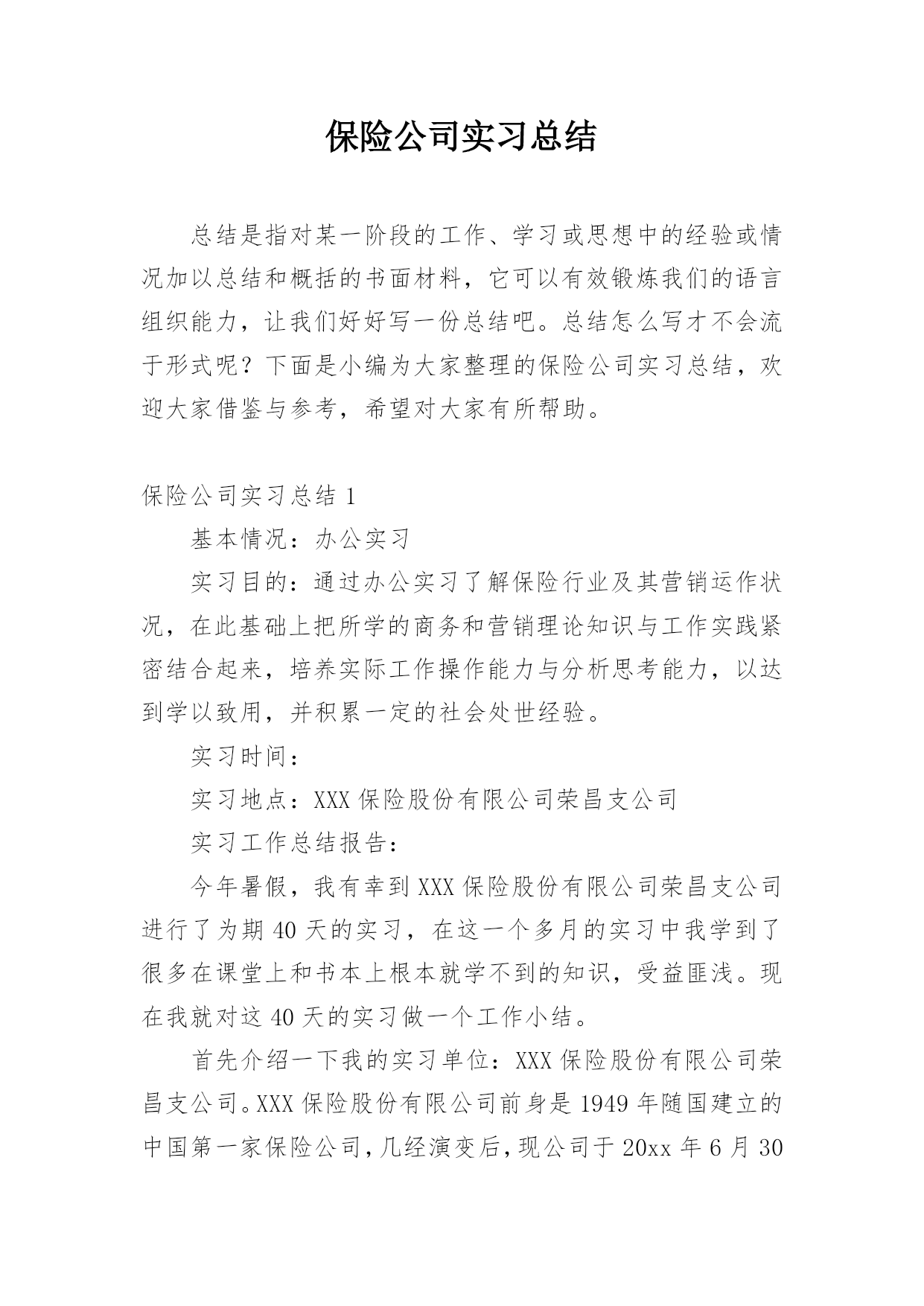 保险公司实习总结总结是指对某一阶段的工作、学习或思想中的经验或情况加以总结和概括的书面材料,它可以有效锻炼我们的语言组织能力,让我们好好写一份总结吧。总结怎么写才不会流于形式呢?下面是小编为大家整理的保险公司实习总结,欢迎大家借鉴与参考,希望对大家有所帮助。保险公司实习总结1基本情况:办公实习实习目的:通过办公实习了解保险行业及其营销运作状况,在此基础上把所学的商务和营销理论知识与工作实践紧密结合起来,培养实际工作操作能力与分析思考能力,以达到学以致用,并积累一定的社会处世经验。实习时间:实习地点:XXX