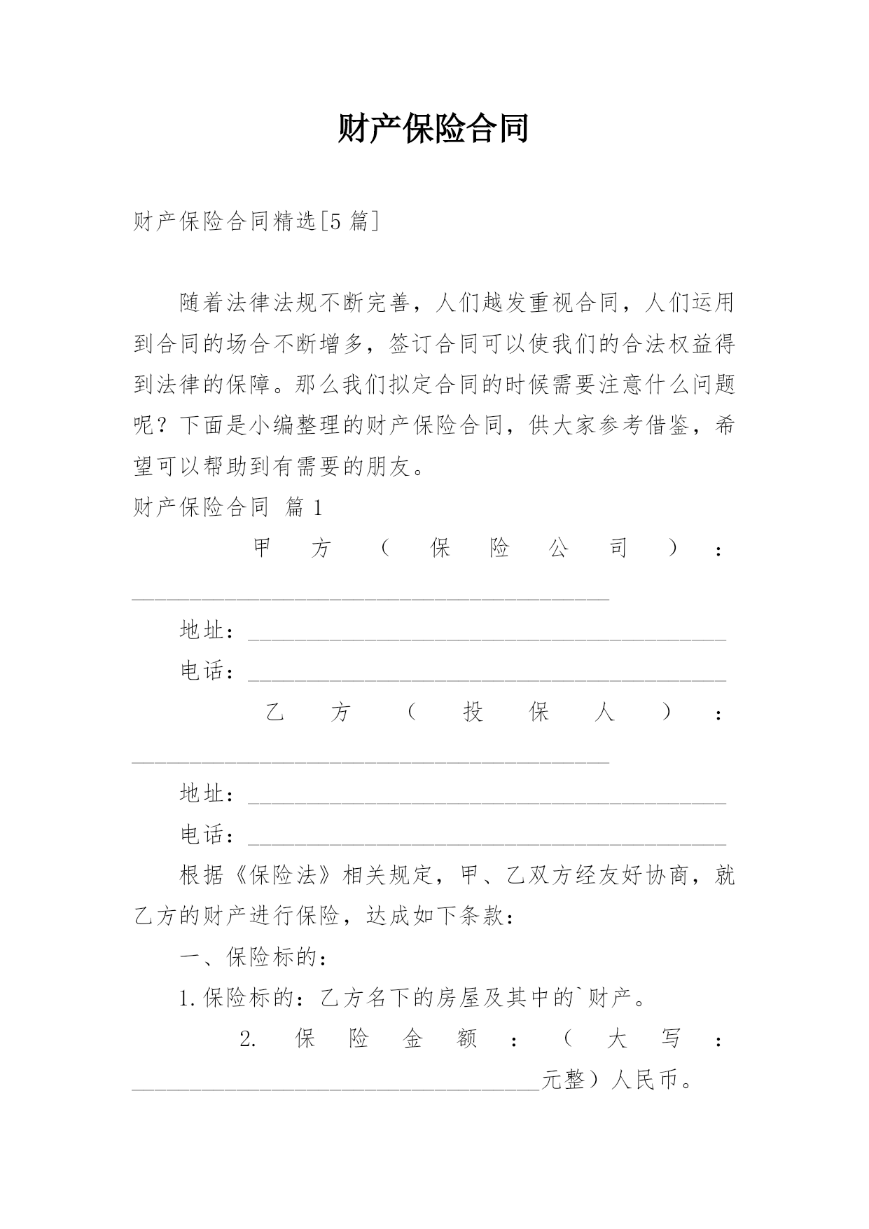 财产保险合同财产保险合同精选[5篇]随着法律法规不断完善,人们越发重视合同,人们运用到合同的场合不断增多,签订合同可以使我们的合法权益得到法律的保障。那么我们拟定合同的时候需要注意什么问题呢?下面是小编整理的财产保险合同,供大家参考借鉴,希望可以帮助到有需要的朋友。财产保险合同篇1甲方(保险公司):_________________________________________地址:_________________________________________电话:_________________