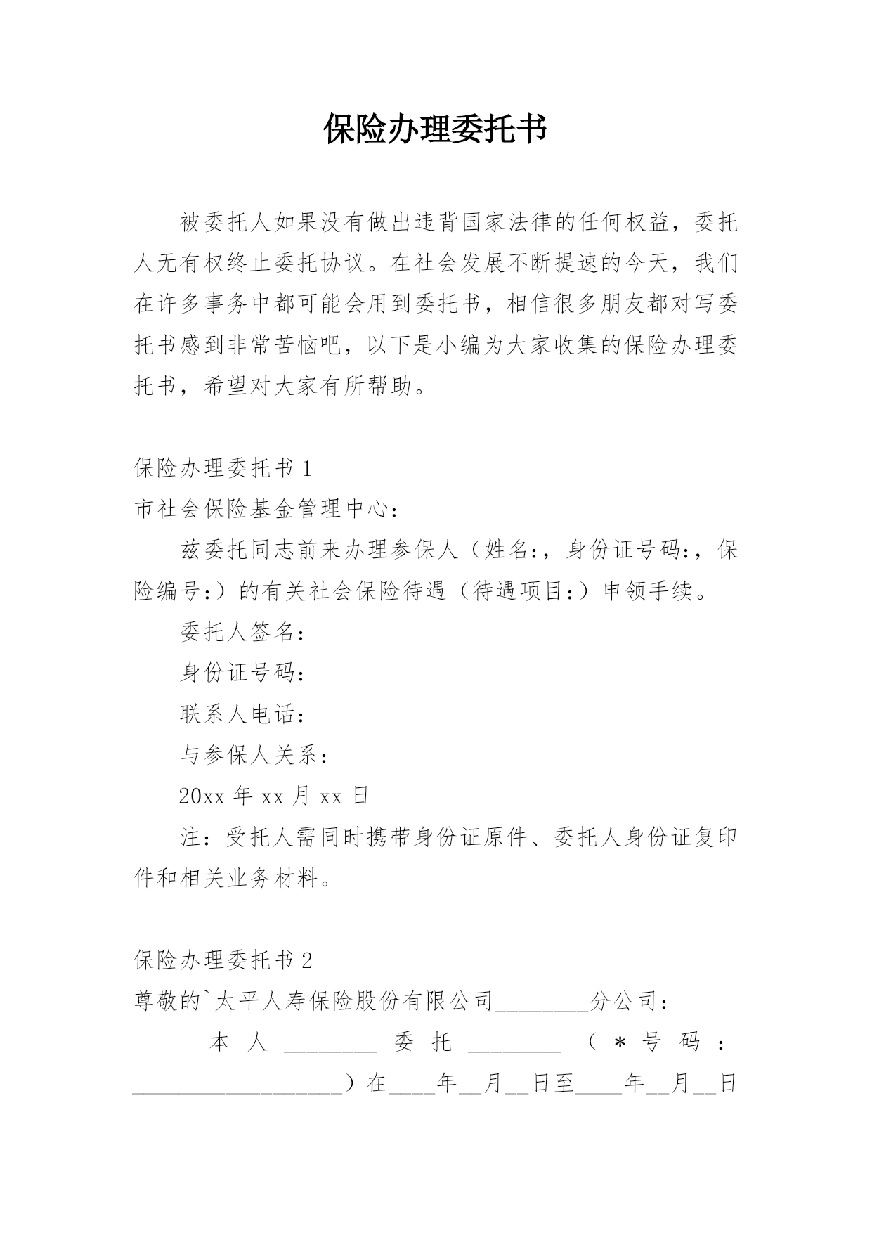 保险办理委托书被委托人如果没有做出违背国家法律的任何权益,委托人无有权终止委托协议。在社会发展不断提速的今天,我们在许多事务中都可能会用到委托书,相信很多朋友都对写委托书感到非常苦恼吧,以下是小编为大家收集的保险办理委托书,希望对大家有所帮助。保险办理委托书1市社会保险基金管理中心:兹委托同志前来办理参保人(姓名:,身份证号码:,保险编号:)的有关社会保险待遇(待遇项目:)申领手续。委托人签名:身份证号码:联系人电话:与参保人关系:20xx年xx月xx日注:受托人需同时携带身份证原件、委托人身份证复印件和