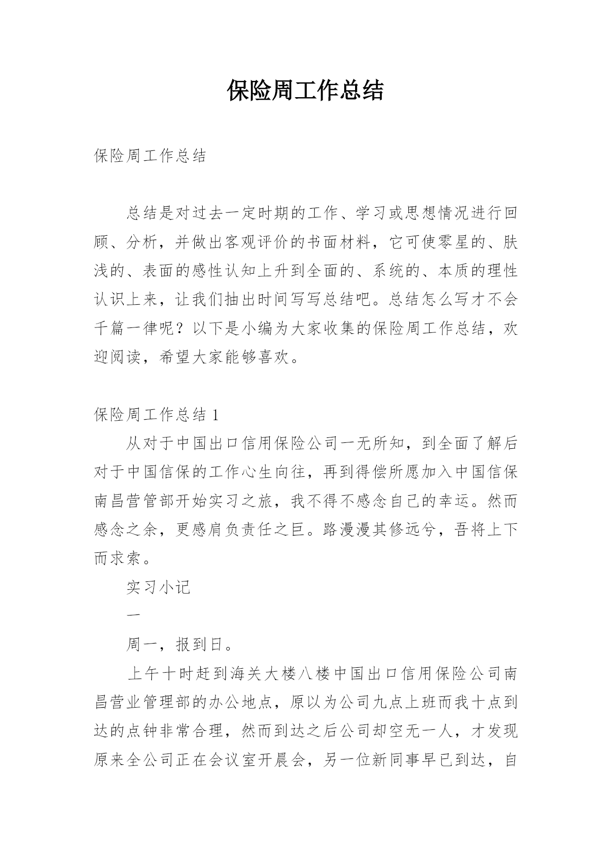保险周工作总结保险周工作总结总结是对过去一定时期的工作、学习或思想情况进行回顾、分析,并做出客观评价的书面材料,它可使零星的、肤浅的、表面的感性认知上升到全面的、系统的、本质的理性认识上来,让我们抽出时间写写总结吧。总结怎么写才不会千篇一律呢?以下是小编为大家收集的保险周工作总结,欢迎阅读,希望大家能够喜欢。保险周工作总结1从对于中国出口信用保险公司一无所知,到全面了解后对于中国信保的工作心生向往,再到得偿所愿加入中国信保南昌营管部开始实习之旅,我不得不感念自己的幸运。然而感念之余,更感肩负责任之巨。路漫