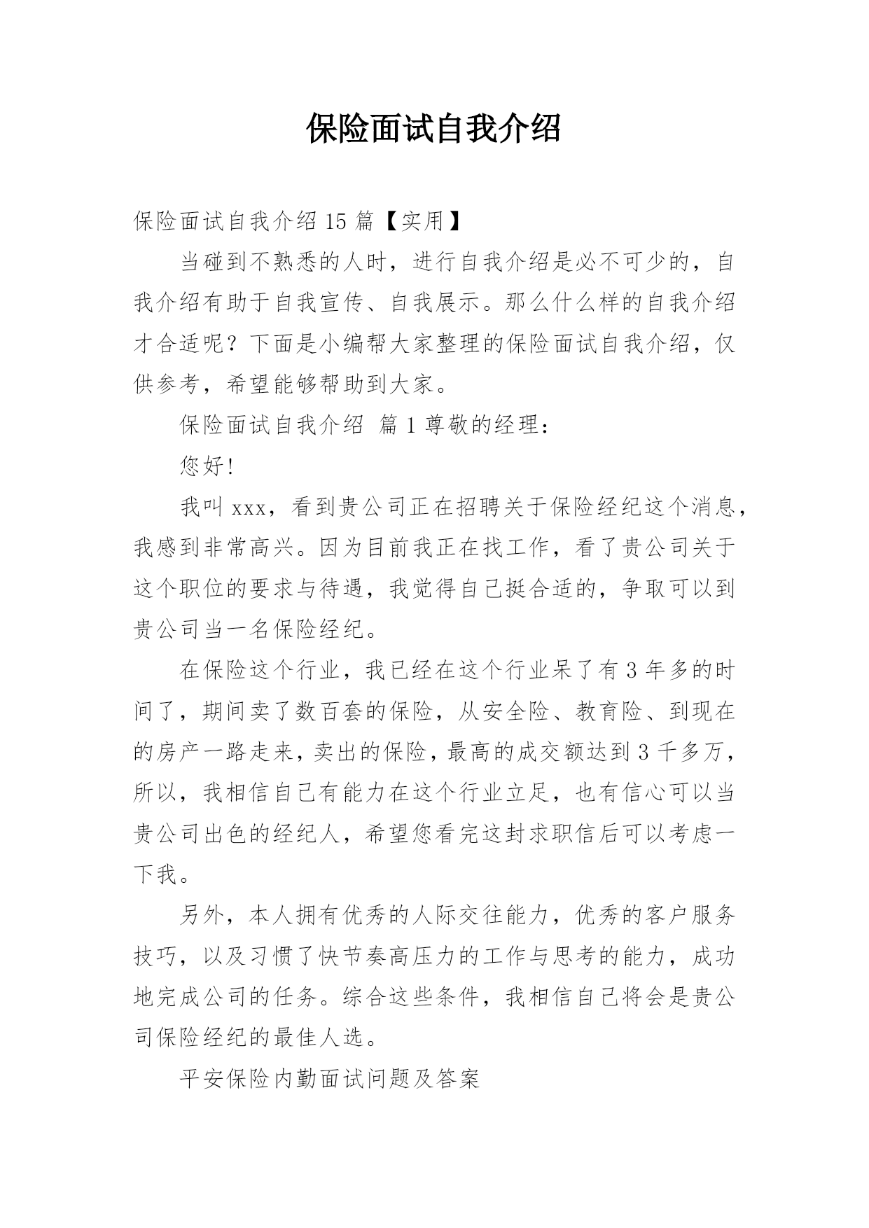 保险面试自我介绍保险面试自我介绍15篇【实用】当碰到不熟悉的人时,进行自我介绍是必不可少的,自我介绍有助于自我宣传、自我展示。那么什么样的自我介绍才合适呢?下面是小编帮大家整理的保险面试自我介绍,仅供参考,希望能够帮助到大家。保险面试自我介绍篇1尊敬的经理:您好!我叫xxx,看到贵公司正在招聘关于保险经纪这个消息,我感到非常高兴。因为目前我正在找工作,看了贵公司关于这个职位的要求与待遇,我觉得自己挺合适的,争取可以到贵公司当一名保险经纪。在保险这个行业,我已经在这个行业呆了有3年多的时间了,期间卖了数百套