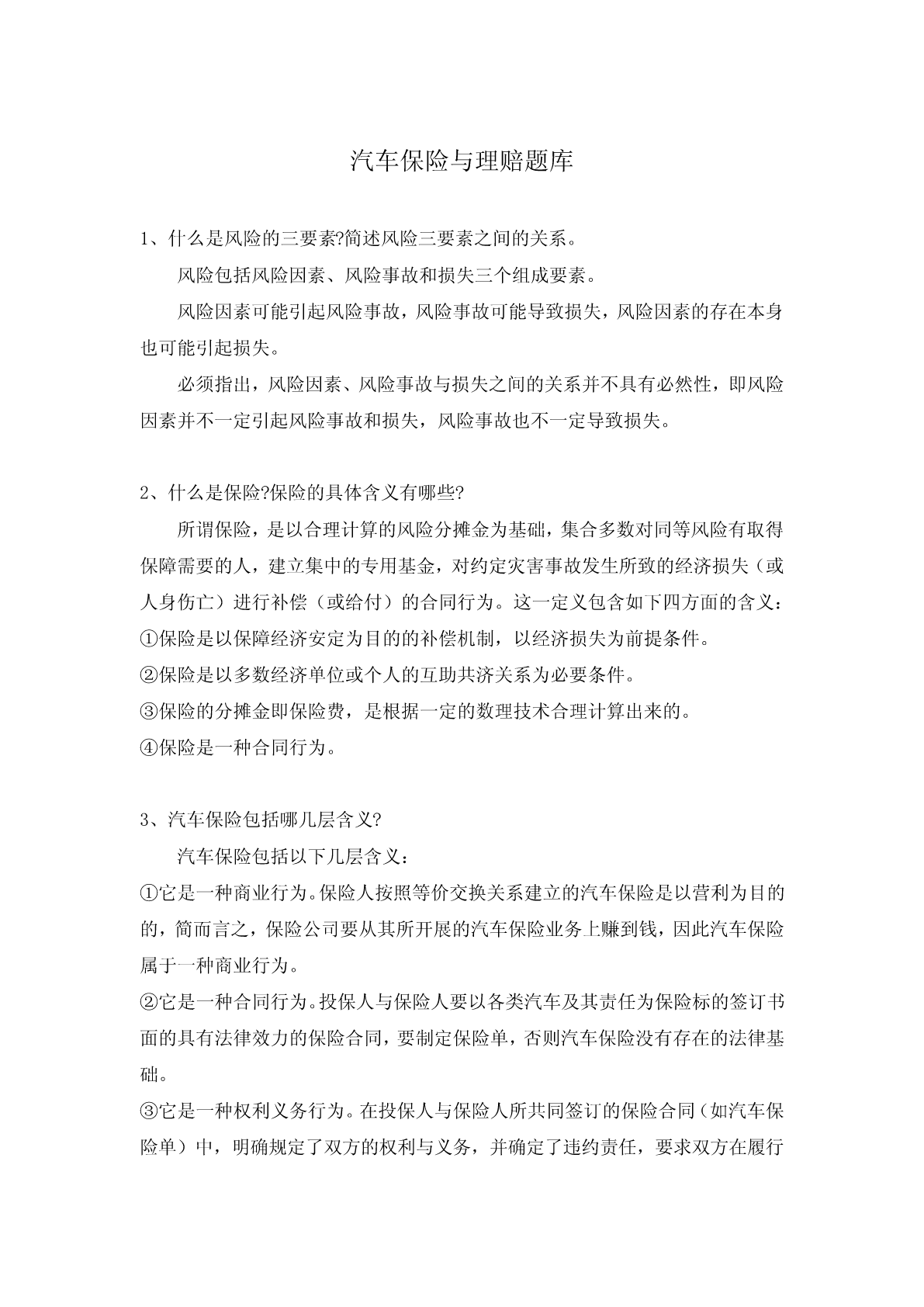 汽车保险与理赔题库1、什么是风险的三要素?简述风险三要素之间的关系。风险包括风险因素、风险事故和损失三个组成要素。风险因素可能引起风险事故,风险事故可能导致损失,风险因素的存在本身也可能引起损失。必须指出,风险因素、风险事故与损失之间的关系并不具有必然性,即风险因素并不一定引起风险事故和损失,风险事故也不一定导致损失。2、什么是保险?保险的具体含义有哪些?所谓保险,是以合理计算的风险分摊金为基础,集合多数对同等风险有取得保障需要的人,建立集中的专用基金,对约定灾害事故发生所致的经济损失(或人身伤亡)进行补