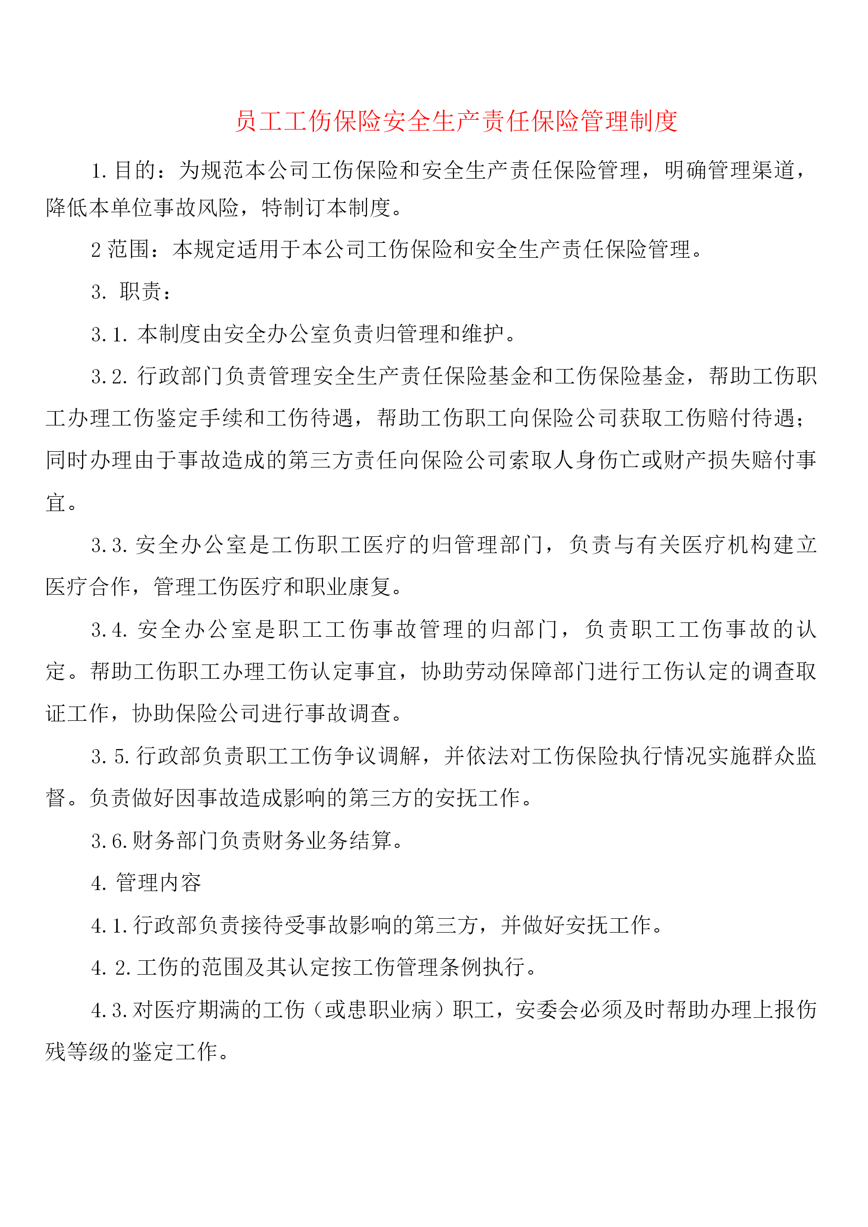员工工伤保险安全生产责任保险管理制度1.目的:为规范本公司工伤保险和安全生产责任保险管理,明确管理渠道,降低本单位事故风险,特制订本制度。2范围:本规定适用于本公司工伤保险和安全生产责任保险管理。职责:本制度由安全办公室负责归管理和维护。行政部门负责管理安全生产责任保险基金和工伤保险基金,帮助工伤职工办理工伤鉴定手续和工伤待遇,帮助工伤职工向保险公司获取工伤赔付待遇;同时办理由于事故造成的第三方责任向保险公司索取人身伤亡或财产损失赔付事宜。安全办公室是工伤职工医疗的归管理部门,负责与有关医疗机构建立医疗合