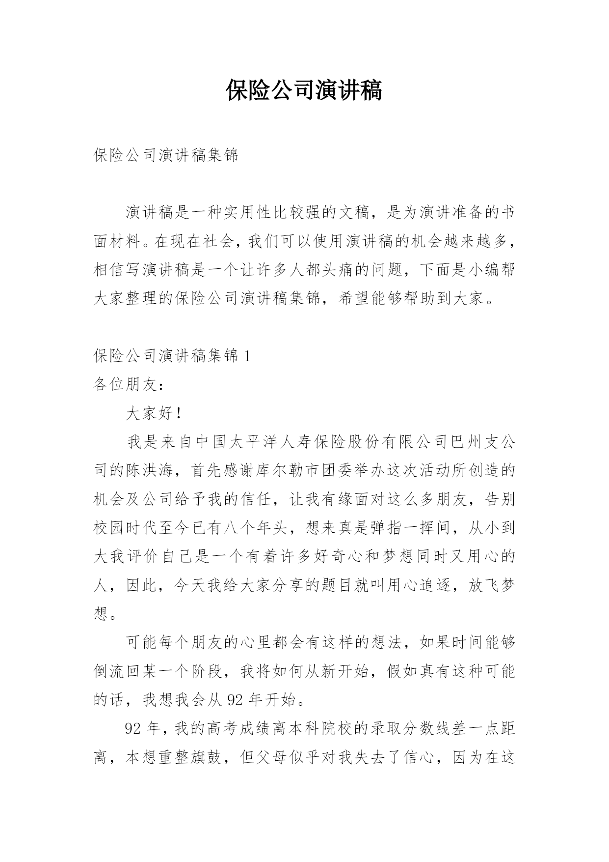 保险公司演讲稿保险公司演讲稿集锦演讲稿是一种实用性比较强的文稿,是为演讲准备的书面材料。在现在社会,我们可以使用演讲稿的机会越来越多,相信写演讲稿是一个让许多人都头痛的问题,下面是小编帮大家整理的保险公司演讲稿集锦,希望能够帮助到大家。保险公司演讲稿集锦1各位朋友:大家好!我是来自中国太平洋人寿保险股份有限公司巴州支公司的陈洪海,首先感谢库尔勒市团委举办这次活动所创造的机会及公司给予我的信任,让我有缘面对这么多朋友,告别校园时代至今已有八个年头,想来真是弹指一挥间,从小到大我评价自己是一个有着许多好奇心和