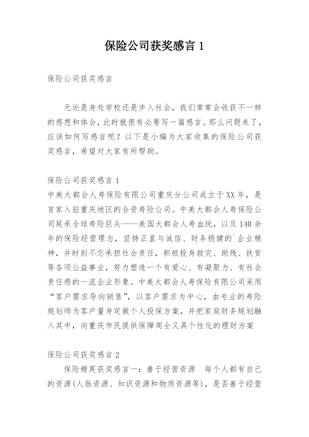保险公司获奖感言1保险公司获奖感言无论是身处学校还是步入社会,我们常常会收获不一样的感想和体会,此时就很有必要写一篇感言。那么问题来了,应该如何写感言呢?以下是小编为大家收集的保险公司获奖感言,希望对大家有所帮助。保险公司获奖感言1中美大都会人寿保险有限公司重庆分公司成立于XX年,是首家入驻重庆地区的合资寿险公司。中美大都会人寿保险公司延承全球寿险巨头——美国大都会人寿血统,以及140余年的保险经营理念,坚持正直与诚信、财务稳健的`企业精神,并时刻不忘承担社会责任,积极投身救灾、助残、扶贫等各项公益事业,