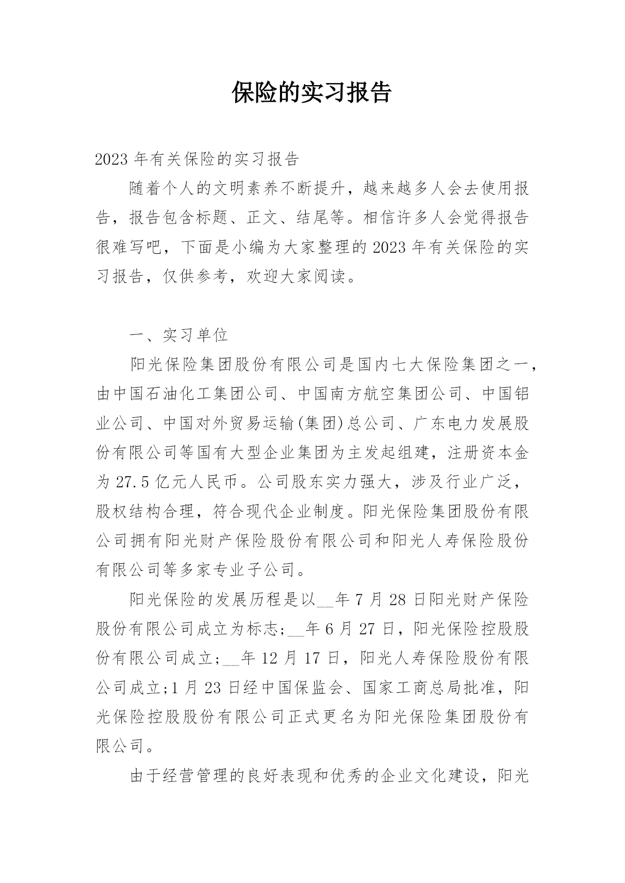 保险的实习报告2023年有关保险的实习报告随着个人的文明素养不断提升,越来越多人会去使用报告,报告包含标题、正文、结尾等。相信许多人会觉得报告很难写吧,下面是小编为大家整理的2023年有关保险的实习报告,仅供参考,欢迎大家阅读。一、实习单位阳光保险集团股份有限公司是国内七大保险集团之一,由中国石油化工集团公司、中国南方航空集团公司、中国铝业公司、中国对外贸易运输(集团)总公司、广东电力发展股份有限公司等国有大型企业集团为主发起组建,注册资本金为27.5亿元人民币。公司股东实力强大,涉及行业广泛,股权结构合