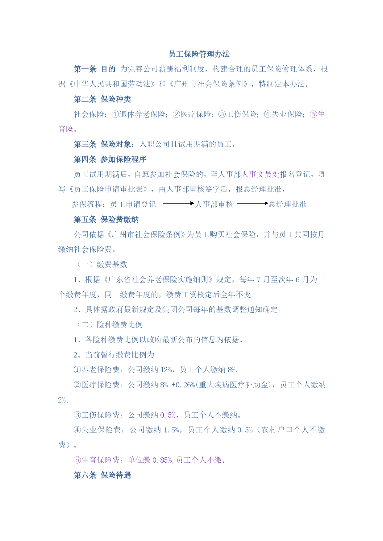 员工保险管理办法第一条目的为完善公司薪酬福利制度,构建合理的员工保险管理体系,根据《中华人民共和国劳动法》和《广州市社会保险条例》,特制定本办法。第二条保险种类社会保险:①退休养老保险;②医疗保险;③工伤保险;④失业保险;⑤生育险。第三条保险对象:入职公司且试用期满的员工。第四条参加保险程序员工试用期满后,自愿参加社会保险的,至人事部人事文员处报名登记,填写《员工保险申请审批表》,由人事部审核签字后,报总经理批准。参保流程:员工申请登记人事部审核总经理批准第五条保险费缴纳公司依据《广州市社会保险条例》为员