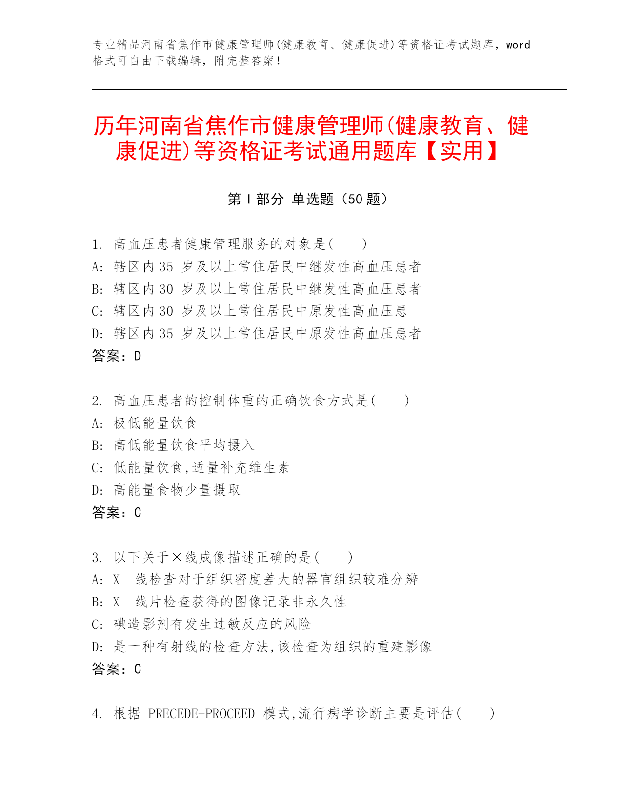 专业精品河南省焦作市健康管理师(健康教育、健康促进)等资格证考试题库,word格式可自由下载编辑,附完整答案!历年河南省焦作市健康管理师(健康教育、健康促进)等资格证考试通用题库【实用】第I部分单选题(50题)1.高血压患者健康管理服务的对象是()A:辖区内35岁及以上常住居民中继发性高血压患者B:辖区内30岁及以上常住居民中继发性高血压患者C:辖区内30岁及以上常住居民中原发性高血压患D:辖区内35岁及以上常住居民中原发性高血压患者答案:D2.高血压患者的控制体重的正确饮食方式是()A:极低能量饮食B: