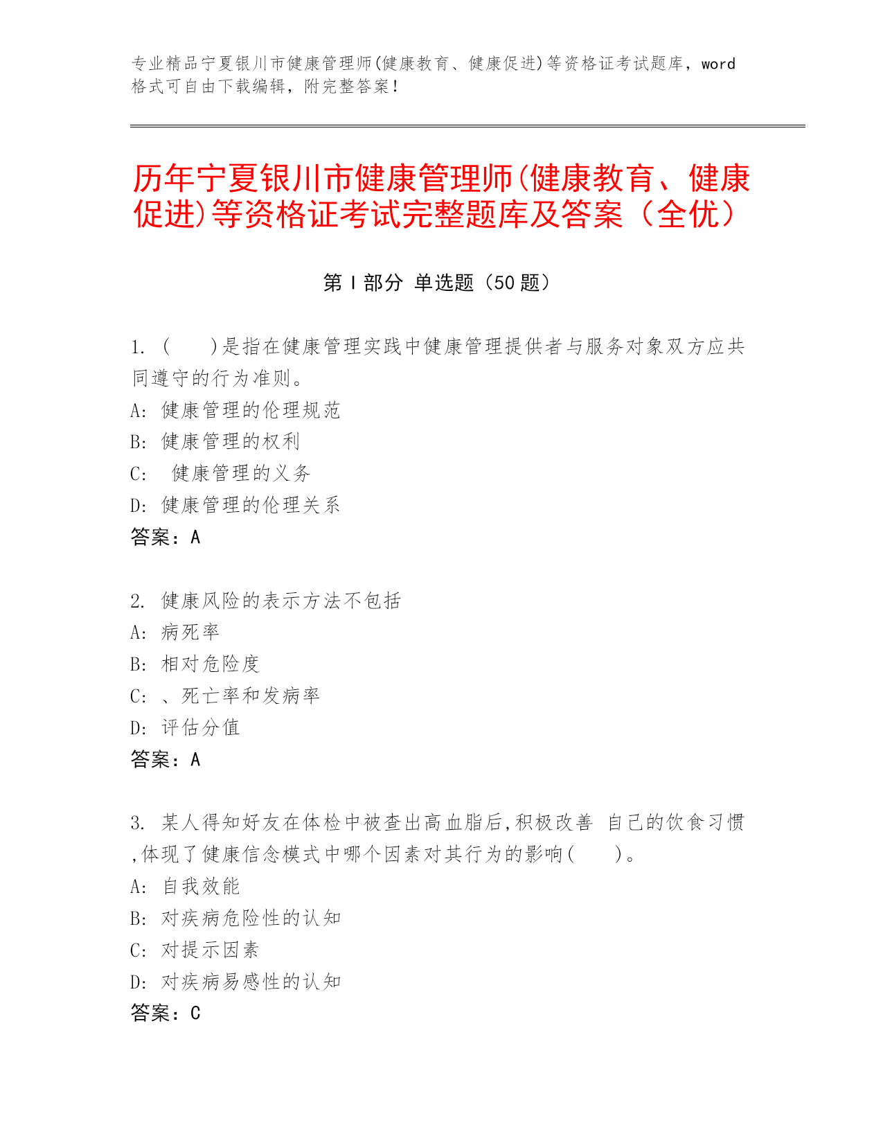 历年宁夏银川市健康管理师(健康教育、健康促进)等资格证考试完整题库及答案(全优).docx