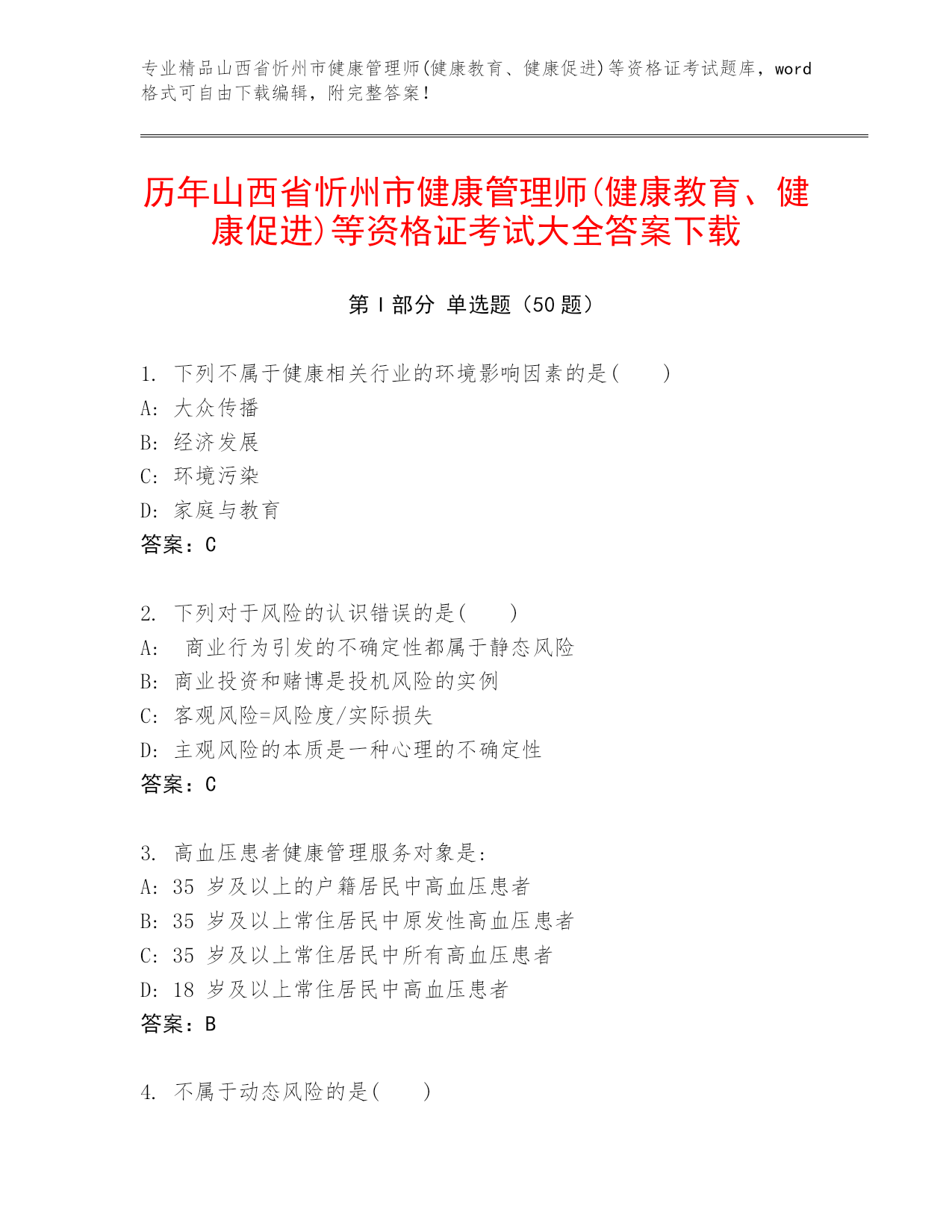 历年山西省忻州市健康管理师(健康教育、健康促进)等资格证考试大全答案下载.docx
