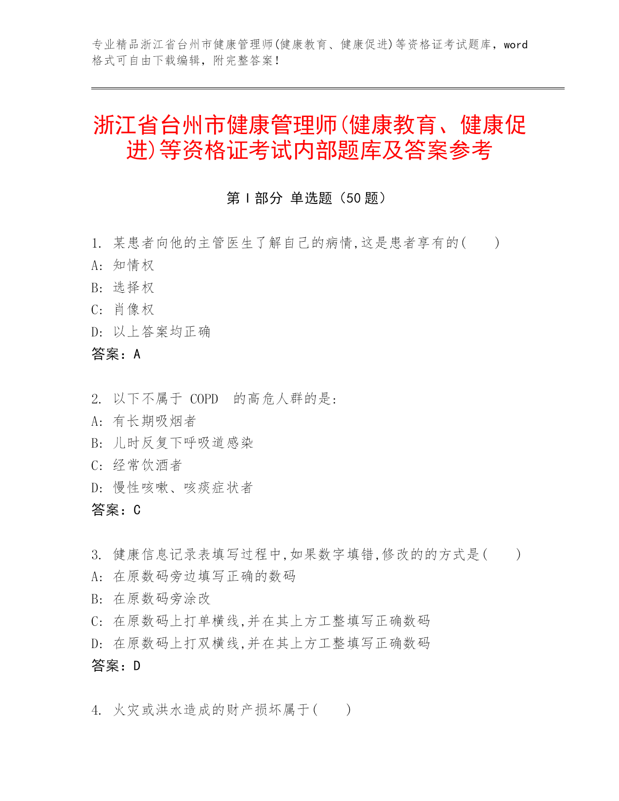 浙江省台州市健康管理师(健康教育、健康促进)等资格证考试内部题库及答案参考.docx