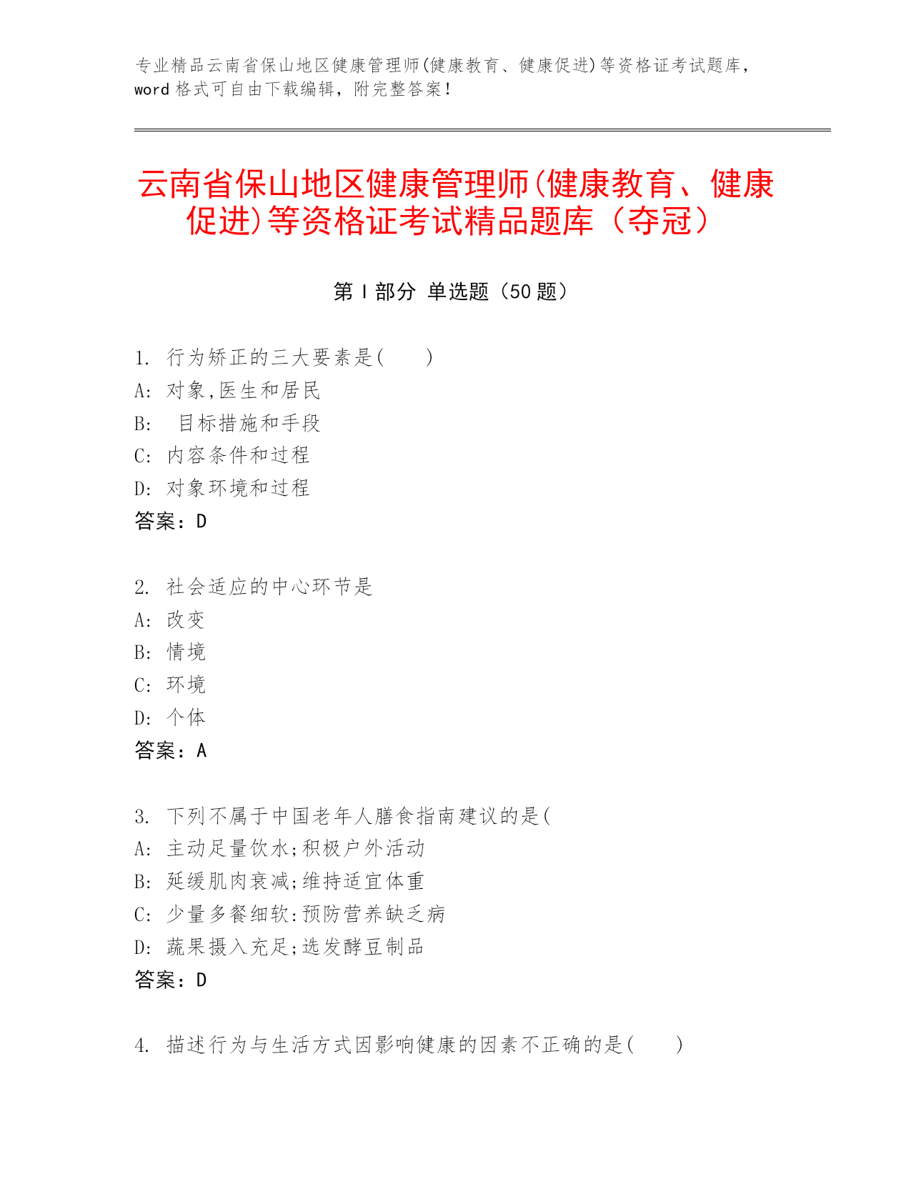 云南省保山地区健康管理师(健康教育、健康促进)等资格证考试精品题库(夺冠).docx