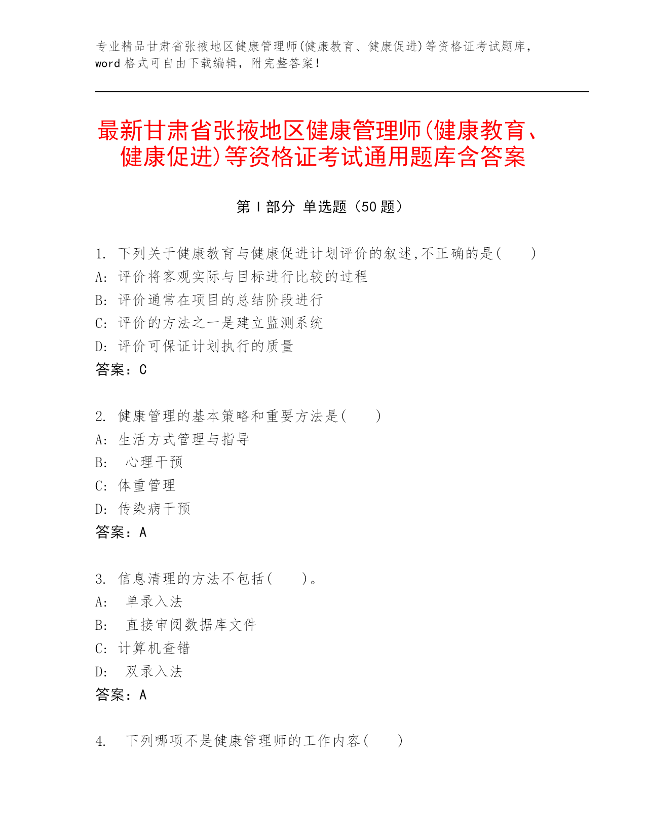 最新甘肃省张掖地区健康管理师(健康教育、健康促进)等资格证考试通用题库含答案.docx