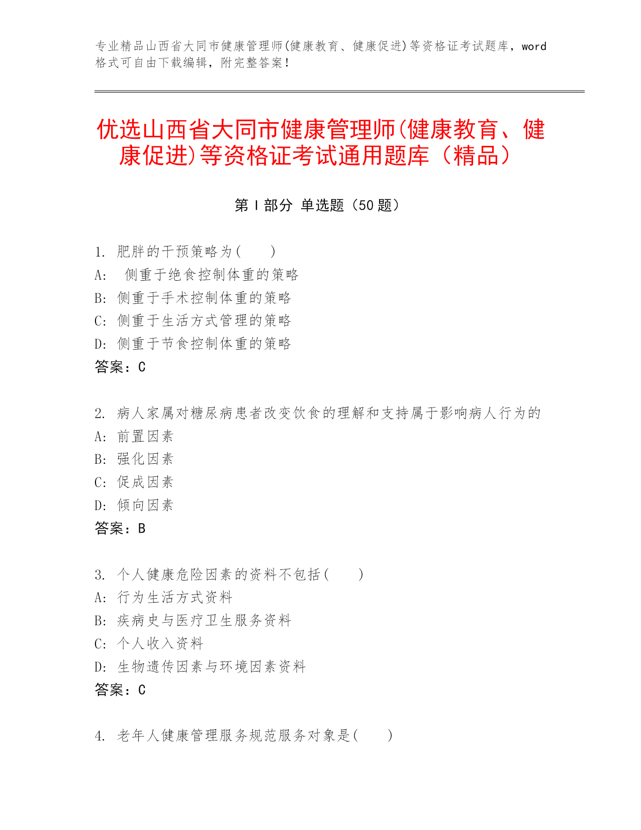 优选山西省大同市健康管理师(健康教育、健康促进)等资格证考试通用题库(精品).docx
