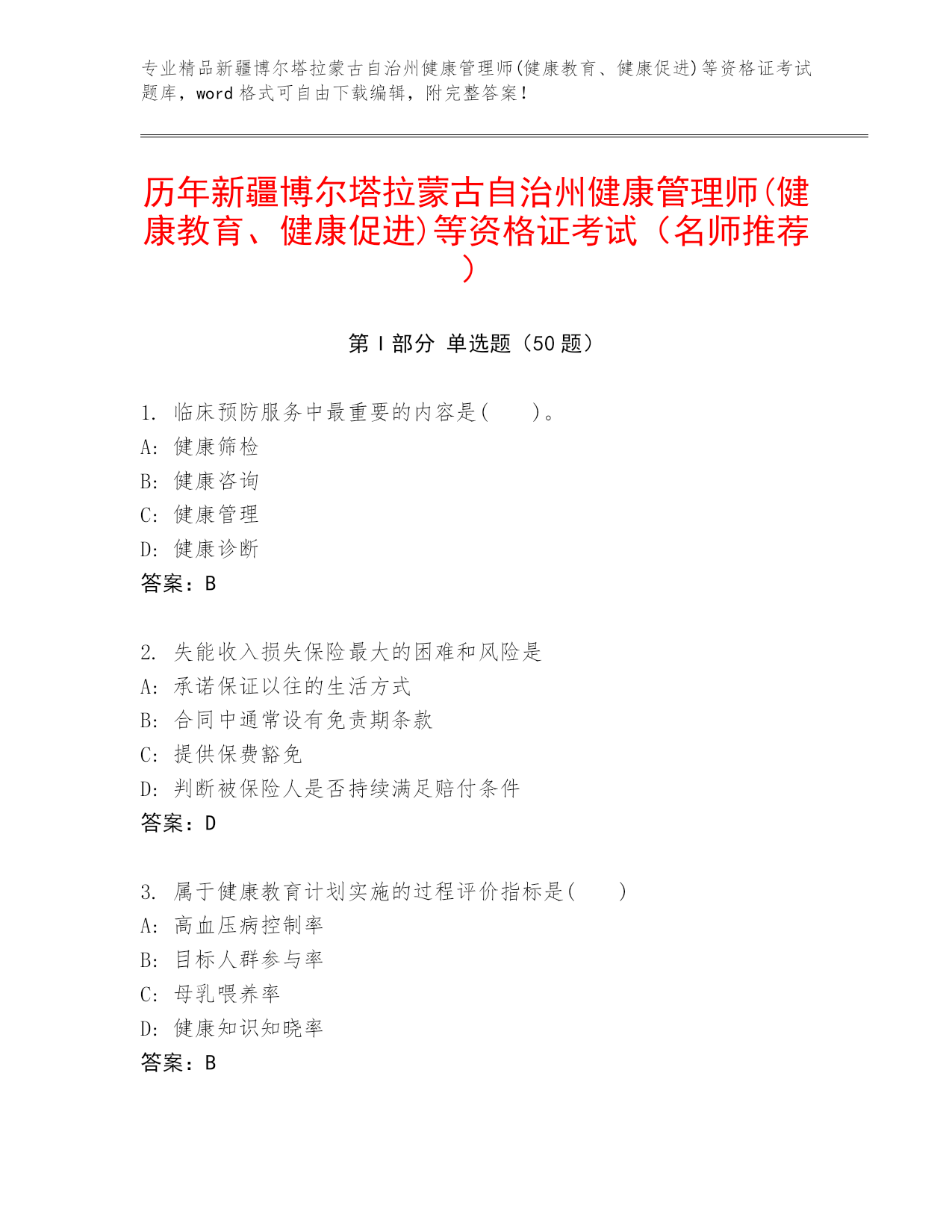 历年新疆博尔塔拉蒙古自治州健康管理师(健康教育、健康促进)等资格证考试(名师推荐).docx