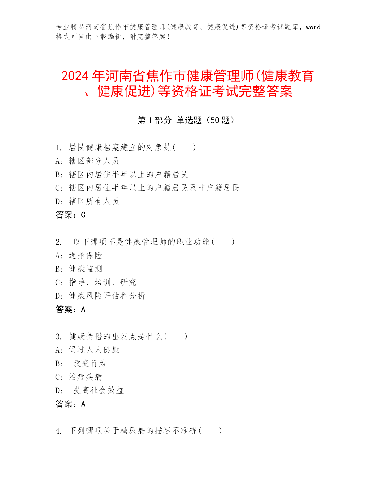 2024年河南省焦作市健康管理师(健康教育、健康促进)等资格证考试完整答案.docx