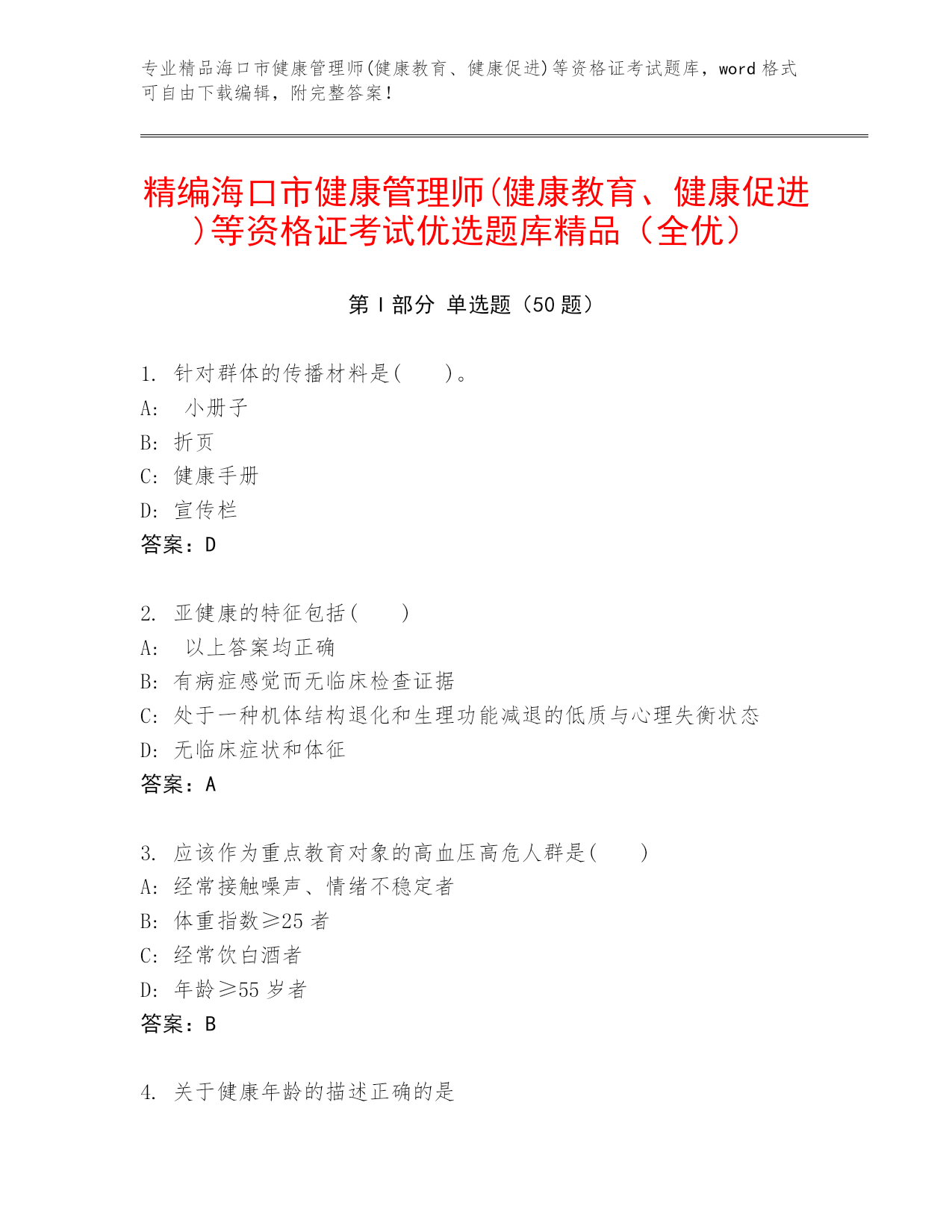 精编海口市健康管理师(健康教育、健康促进)等资格证考试优选题库精品(全优).docx