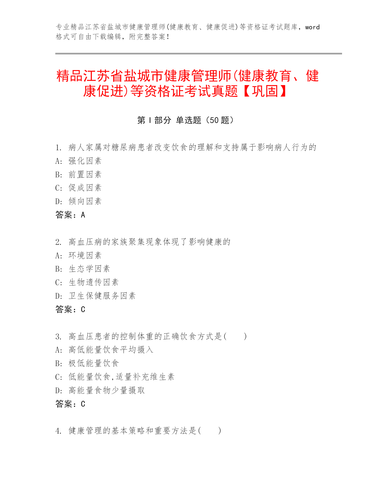 精品江苏省盐城市健康管理师(健康教育、健康促进)等资格证考试真题【巩固】.docx