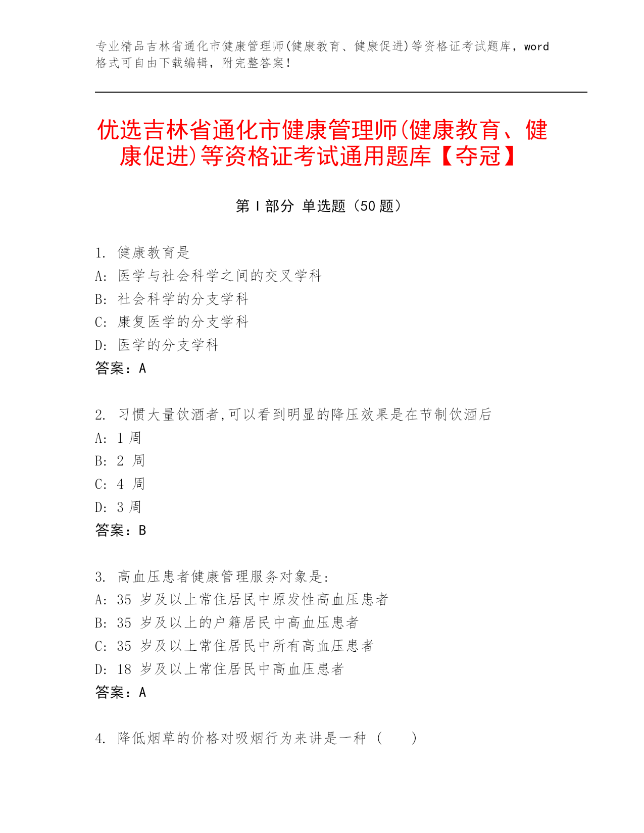 专业精品吉林省通化市健康管理师(健康教育、健康促进)等资格证考试题库,word格式可自由下载编辑,附完整答案!优选吉林省通化市健康管理师(健康教育、健康促进)等资格证考试通用题库【夺冠】第I部分单选题(50题)1.健康教育是A:医学与社会科学之间的交叉学科B:社会科学的分支学科C:康复医学的分支学科D:医学的分支学科答案:A2.习惯大量饮酒者,可以看到明显的降压效果是在节制饮酒后A:1周B:2周C:4周D:3周答案:B3.高血压患者健康管理服务对象是:A:35岁及以上常住居民中原发性高血压患者B:35岁及