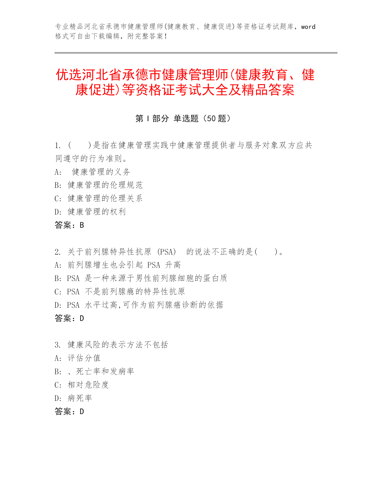 专业精品河北省承德市健康管理师(健康教育、健康促进)等资格证考试题库,word格式可自由下载编辑,附完整答案!优选河北省承德市健康管理师(健康教育、健康促进)等资格证考试大全及精品答案第I部分单选题(50题)1.()是指在健康管理实践中健康管理提供者与服务对象双方应共同遵守的行为准则。A:健康管理的义务B:健康管理的伦理规范C:健康管理的伦理关系D:健康管理的权利答案:B2.关于前列腺特异性抗原(PSA)的说法不正确的是()。A:前列腺增生也会引起PSA升高B:PSA是一种来源于男性前列腺细胞的蛋白质C: